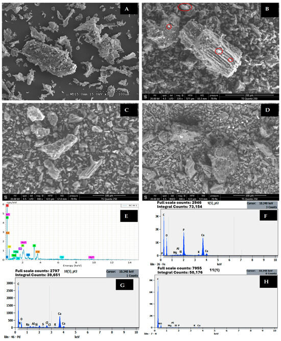 Following PO43− adsorption, dramatic changes are observed in both surface morphology and elemental composition. The carbon content decreases significantly from 75.63% to 64.41%, while phosphorus content increases remarkably from 0.89% to 9.83% (Table 7), representing an approximately 11-fold enrichment. This substantial phosphorus accumulation is accompanied by notable increases in calcium (1.20% to 2.27%) and aluminium (0.04% to 3.04%), suggesting precipitation-based removal mechanisms. SEM-EDX analysis confirms the formation of fine spherical clusters dispersed on the surface of biochar, which were not observed before adsorption. These clusters could be formed due to precipitation of PO43− with metals on the surface of the biochar, naturally present in biochar to form stable mineral phases such as calcium phosphate (Ca3(PO4)2), aluminium phosphate (AlPO4), and potentially magnesium phosphate Mg3(PO4)2 compounds [38,39]. Similar morphological transformations have been documented in numerous studies where EDX mapping confirmed homogeneous distribution of Ca, Mg, and P elements on biochar surfaces after PO43− adsorption, validating precipitation as the dominant mechanism [40,41].