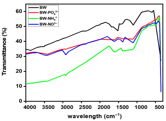Following NH4+ adsorption (BW–NH4+), only 29 peaks were detected compared to 54 in the pristine biochar, indicating substantial chemical changes on the biochar surface. A diagnostic NH4+ deformation band appeared in the 1470–1400 cm−1 range, while subtle variations were observed near 3200–3300 cm−1, corresponding to N–H stretching and H-bonded O–H vibrations. These changes suggest that O2-containing functional groups, such as hydroxyl and carboxyl groups, participated in hydrogen bonding, proton exchange, or ligand interactions with NH4+ ions. Minor decreases or shifts in the C=O and O–H regions further support this interaction. Overall, the loss of peaks and the observed spectral shifts confirm the strong adsorption of NH4+- and explain the higher adsorption capacity recorded for NH4+ among the three nutrients, highlighting the biochar’s preferential affinity for cationic species. In situ ATR-FTIR studies on pinewood biochar have shown similar NH4+-related shifts, consistent with adsorption onto oxygenated functional sites under neutral to alkaline conditions [45,46,47].