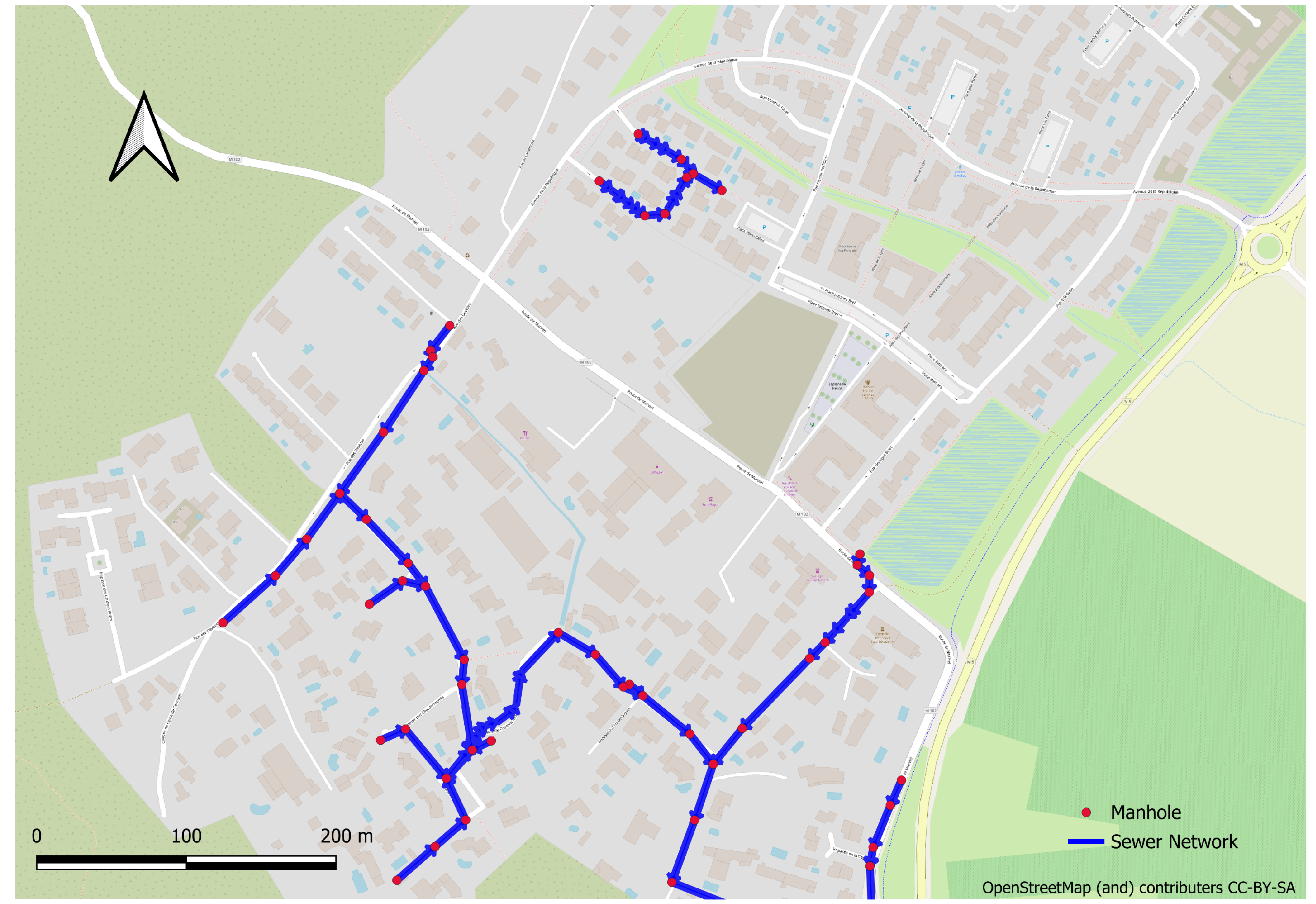 - Montpellier Méditerranée Métropole. Réseaux d’assainissement de Montpellier Méditerranée Métropole. Available online: https://data.montpellier3m.fr/dataset/reseaux-dassainissement-de-montpellier-mediterranee-metropole (accessed on 11 January 2026).