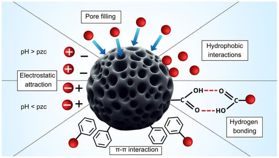 The removal of MPs using modified AC is governed by multiple adsorption mechanisms, such as pore filling, electrostatic attraction, hydrophobic interactions, hydrogen bonding, and π–π interaction. The relative importance of these mechanisms can vary depending on both the MP type (e.g., PE, PS, and PET) and the surface modification of the adsorbent. Figure 3 shows the main mechanisms and their interrelations involved in the removal of MPs and NPs from modified biochar/AC.