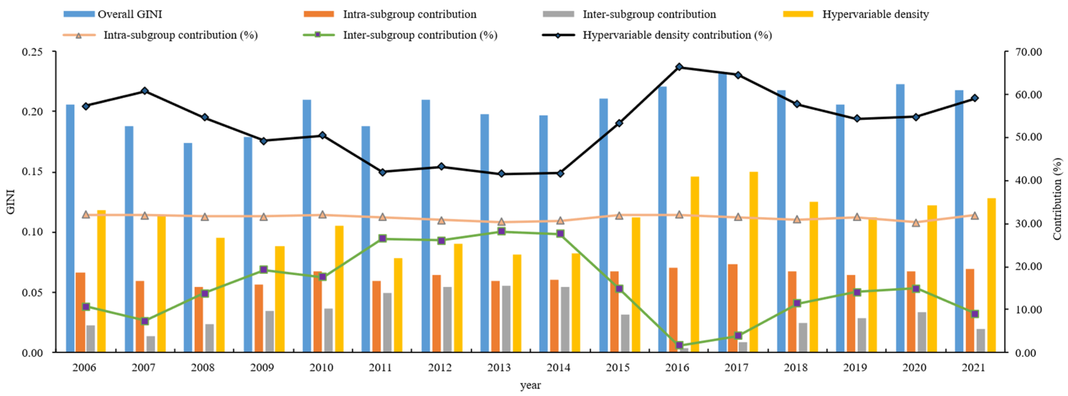 | Year | Overall GINI | Intra-Subgroup Contribution | Inter-Subgroup Contribution | Hypervariable Density | Intra-Subgroup Contribution (%) | Inter-Subgroup Contribution (%) | Hypervariable Density Contribution (%) |