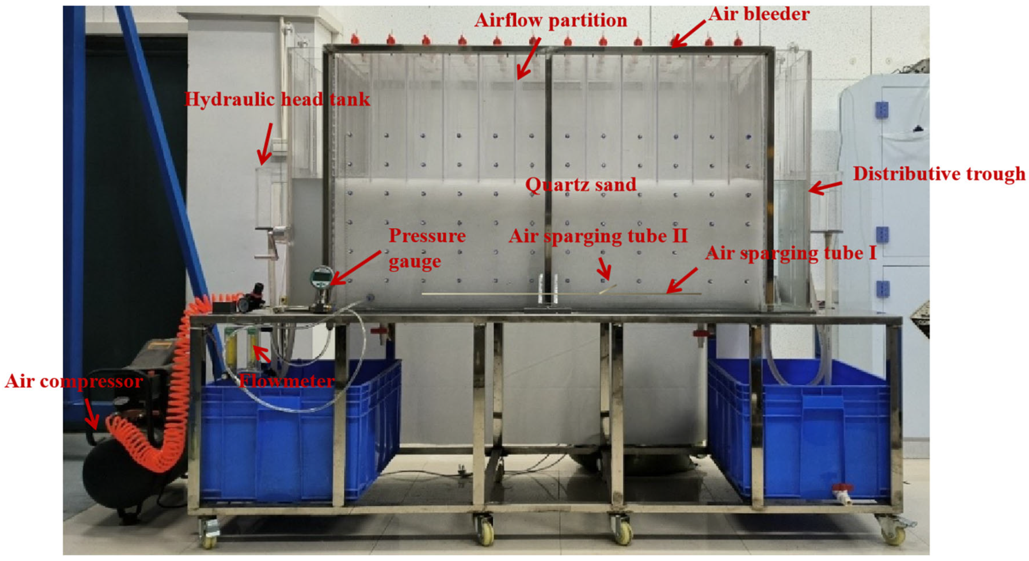 20] reported that airflow generated during HAS application enhanced hydraulic circulation, with nitrobenzene concentrations near the sparger decreasing most rapidly. These findings highlight the significant role of bubble-water interactions in pollutant migration and removal. However, a comprehensive understanding of how airflow migration in aquifers influences pollutant removal is still lacking. Moreover, although AS is widely recognized for its high efficiency in removing VOCs through volatilization and air–water mass transfer, its influence on the transport and retention of non-volatile, dissolved pollutants is still insufficiently understood. In particular, the formation of a gas phase within saturated porous media can alter pore connectivity, reduce effective permeability, and increase interfacial resistance, suggesting that AS may also act as a physical barrier that restricts dissolved contaminant migration. To explore this mechanism, Rhodamine B (RhB) was selected as a representative dissolved tracer. RhB is non-volatile, highly soluble, and easily visualized, making it suitable for quantifying diffusion and migration processes affected by gas-phase formation. By focusing on RhB, this study extends the application of AS beyond volatilization-driven VOC removal and examines its broader potential in controlling the spread of dissolved organic pollutants in groundwater. Further exploration of these aspects is necessary to advance horizontal well aeration technology in environmental remediation.