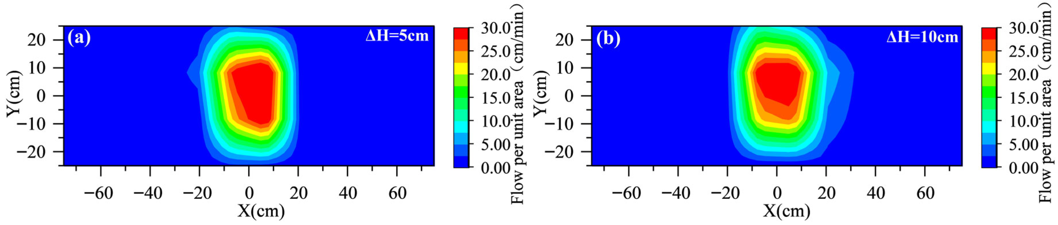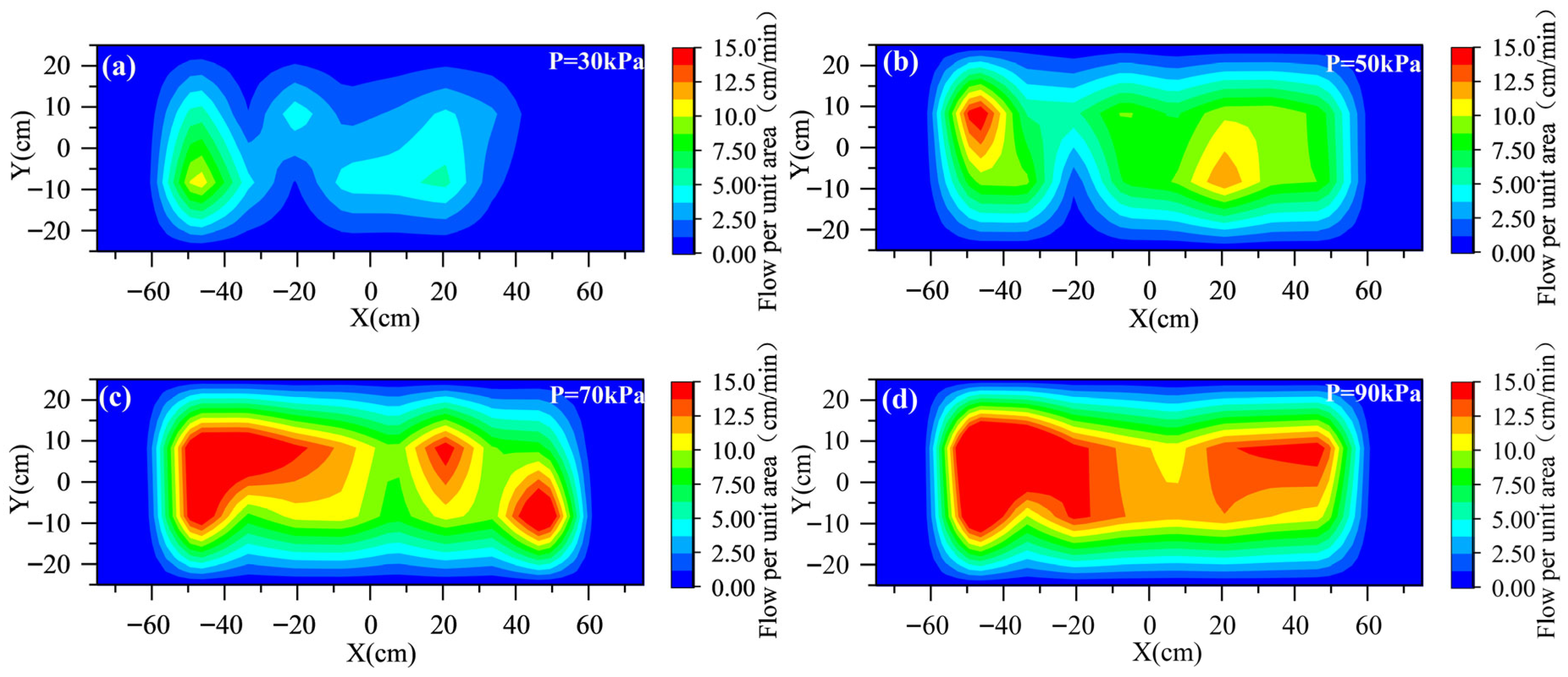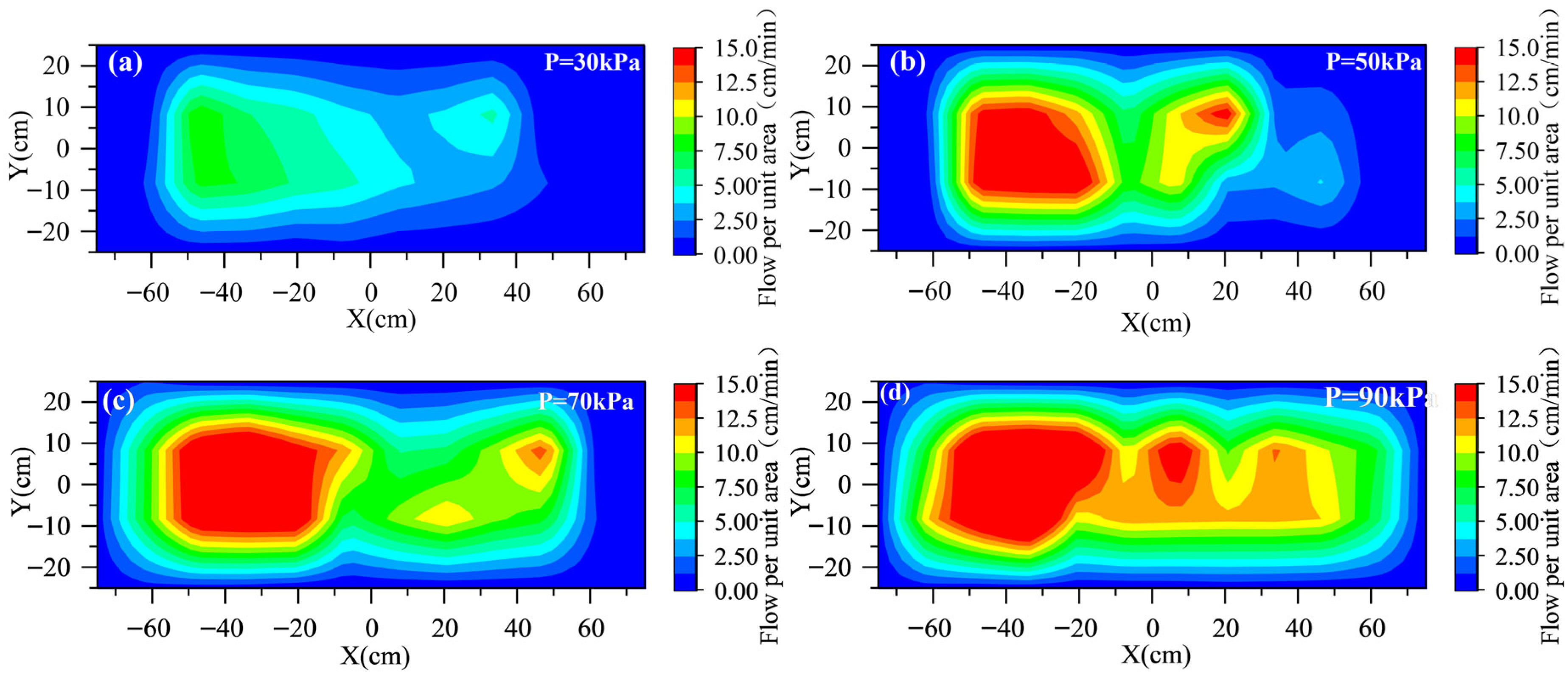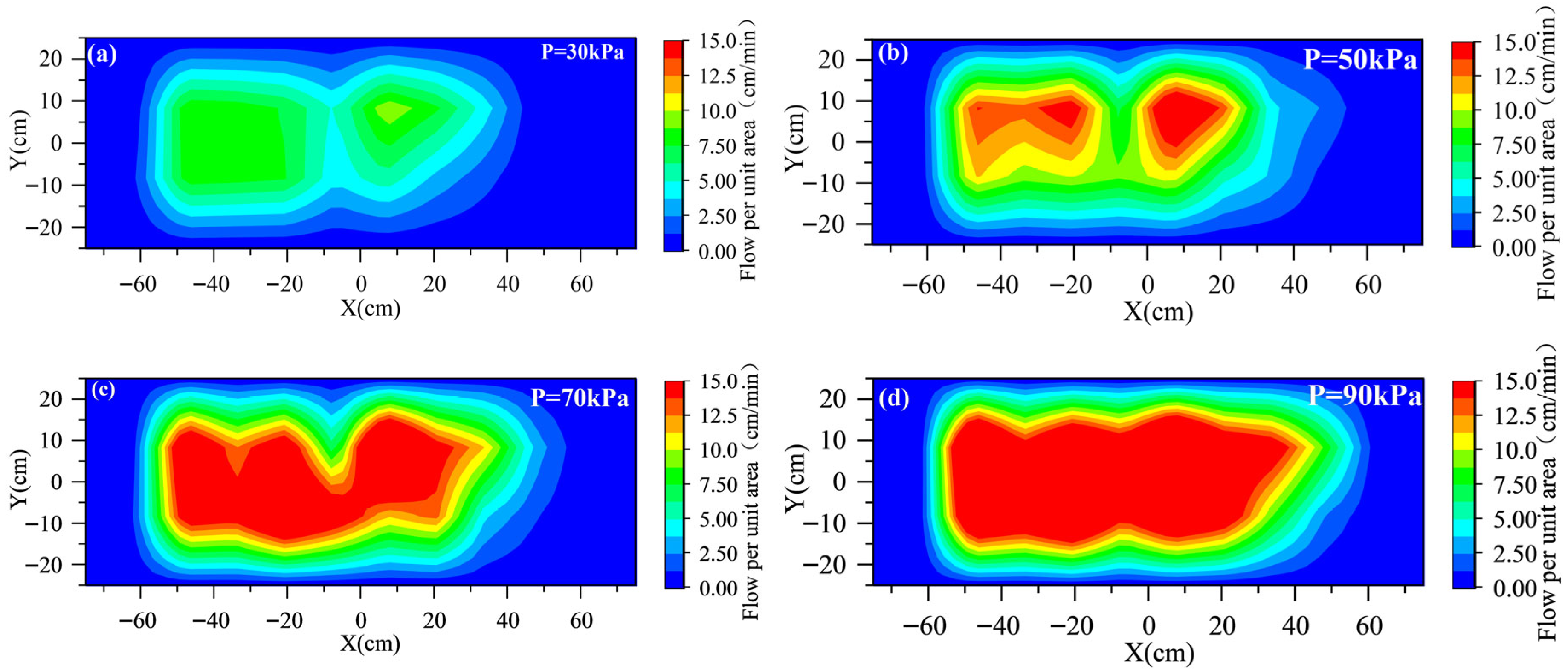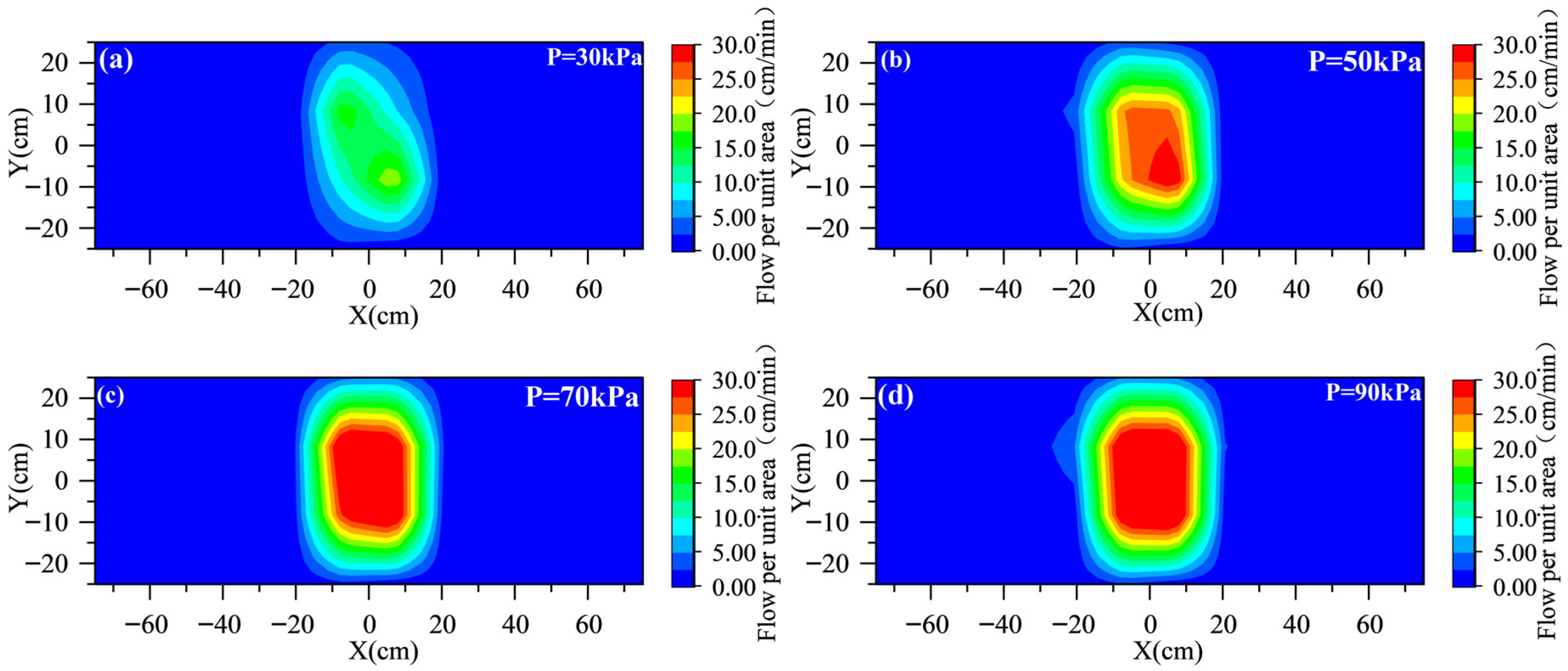 Figure 3 illustrates the distribution characteristics of flow velocity at a burial depth of 20 cm under varying pressures (30–90 kPa). Flow velocity remained low at 30 kPa. The lateral zone of influence (ZOI) area increases from 2356 cm
