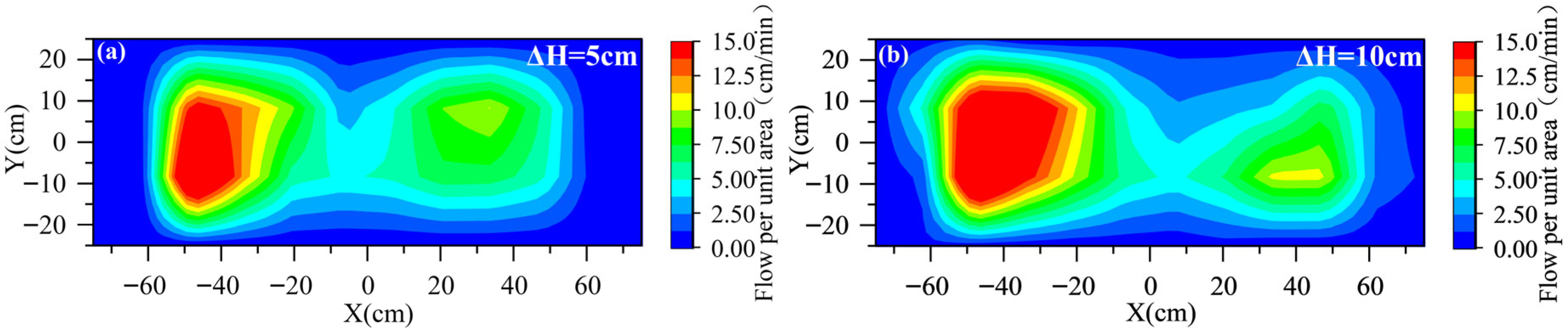 As the head difference increased to ΔH = 10 cm, notable changes in airflow distribution and ZOI characteristics emerged: the airflow distribution shifted toward the right (low head difference side), and the asymmetry of the ZOI shape increased significantly—specifically, the ZOI’s influence range shifted rightward by approximately 10 cm, and the aeration core zone (high flow velocity concentration area) also offset rightward by 6 cm. Despite the spatial shifts, high flow velocity regions remained concentrated near the airflow source end but extended slightly (X = −55 cm to X = −25 cm). Concurrently, airflow in the middle and rear sections of the AS tube (X = −3 cm to X = 55 cm) was compressed, which is attributed to the driving and squeezing effects of groundwater flow on the gas phase.