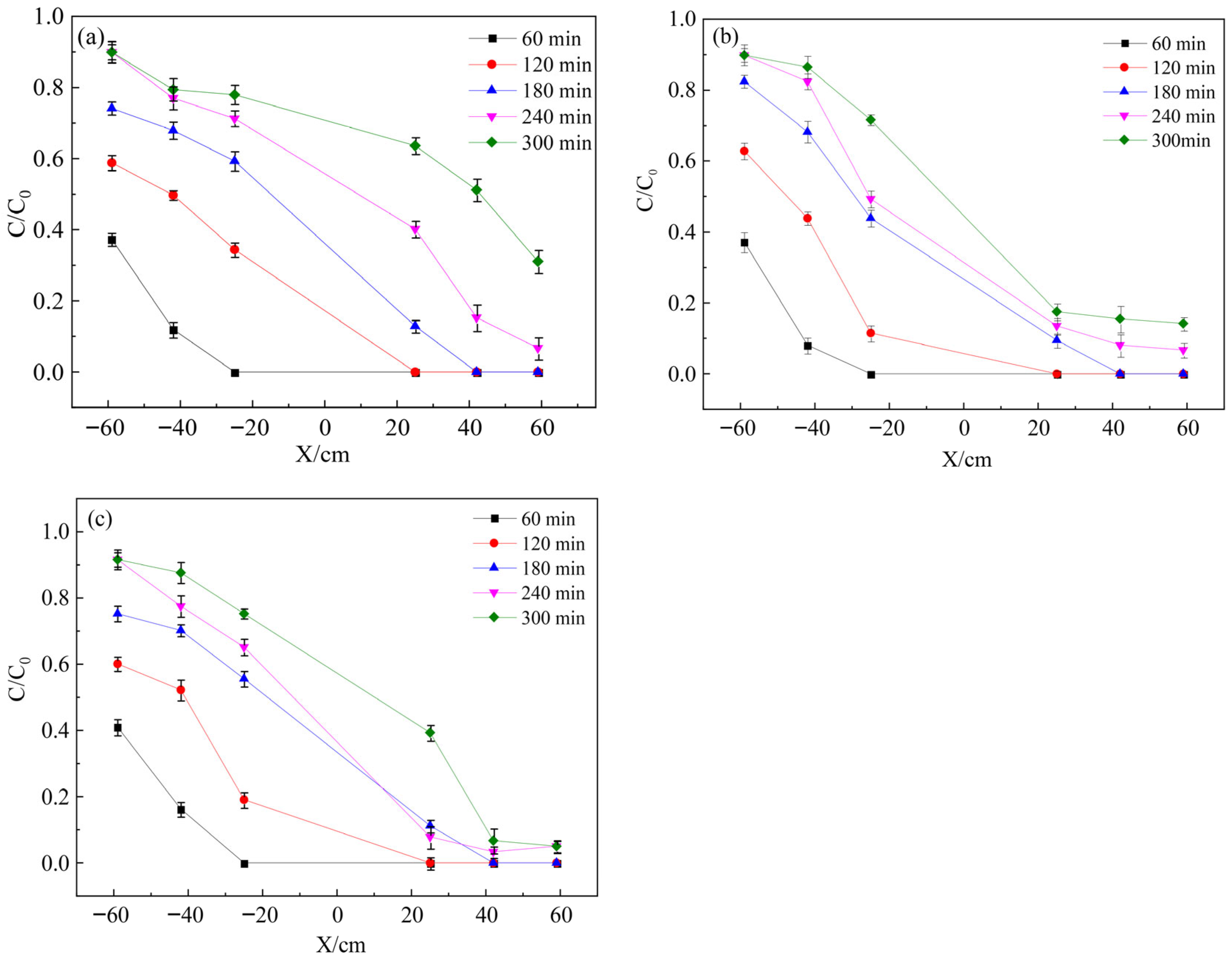 Figure 10 depicts the migration and diffusion characteristics of RhB at various time intervals (60 to 300 min) under non-aerated conditions (
