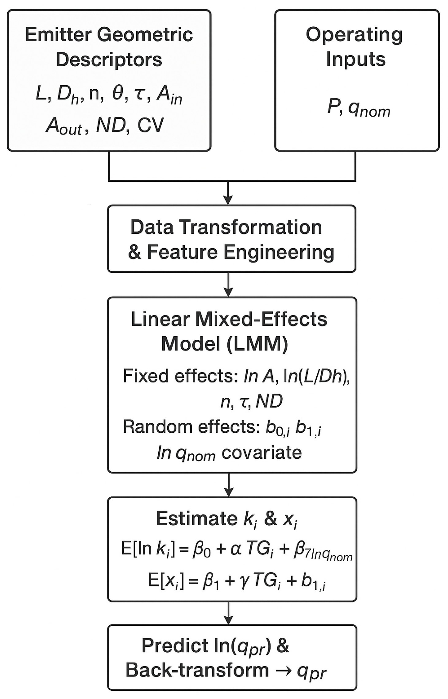 where A is the effective flow area, Dh is the hydraulic diameter, L the path length, n the number of teeth/turns, τ = L/Ls is tortuosity, ND is a binary indicator for the non-drain feature, θ is the summary turning-angle metric, Ain and Aout are inlet/outlet areas, CV(Dh) is the along-path coefficient of variation in hydraulic diameter, and Filter Type represents minimal categorical dummies for inlet filtration design. To avoid over-parameterization with only six emitter types, a parsimonious baseline subset was pre-specified: [ln A, ln (L/Dh), n, τ, ND], while additional terms [θ, ln Ain, ln Aout, CV(Dh)] were included only if they improved AIC and passed multicollinearity checks. Within this framework, the geometry influences both the expected discharge coefficient ki and the pressure exponent xi, which are obtained implicitly from the fitted model as: