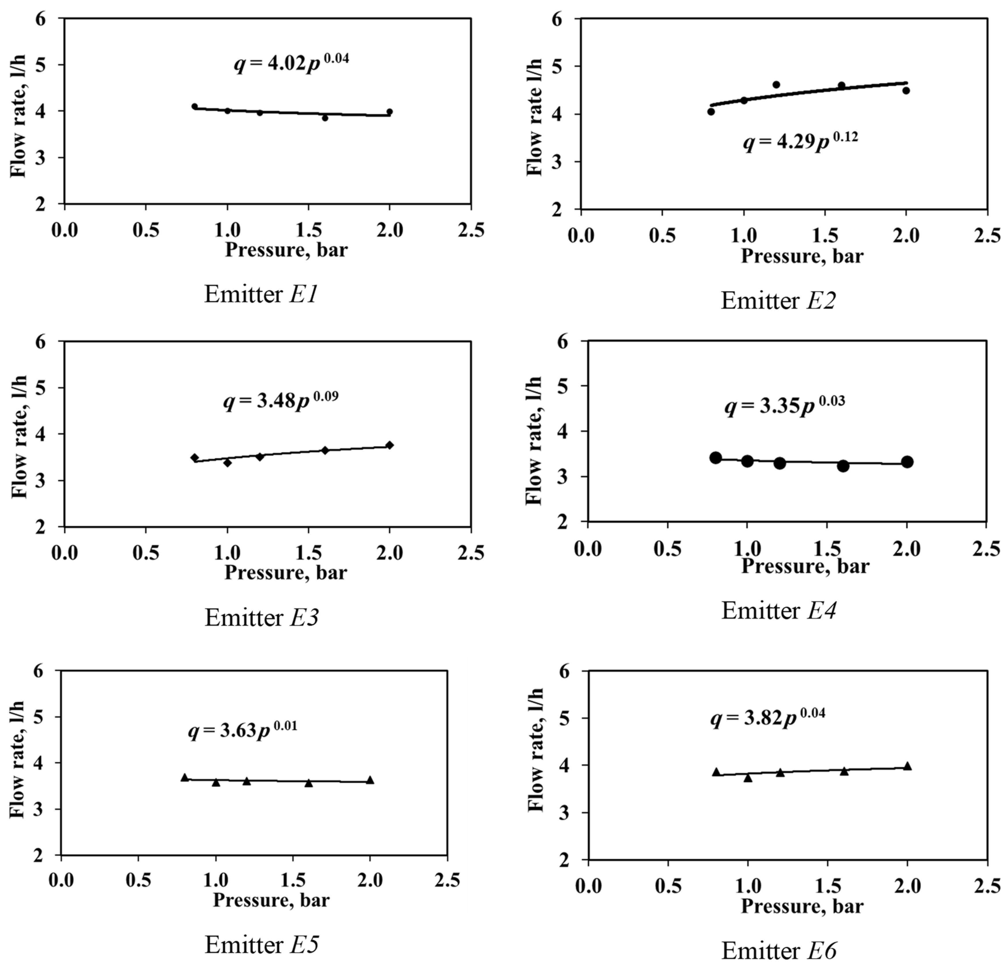 Emitters E5 and E4 displayed nearly horizontal discharge–pressure curves across the tested range (0.8–2.0 bar), confirming their exceptional pressure-compensating ability. Their minimal x values indicate almost invariant discharge with changing pressure, representing near-ideal compensation performance. E1 and E6, both with x = 0.04, exhibited slightly steeper slopes but maintained stable flow rates within the practical operating range, thus remaining effectively pressure-compensating.