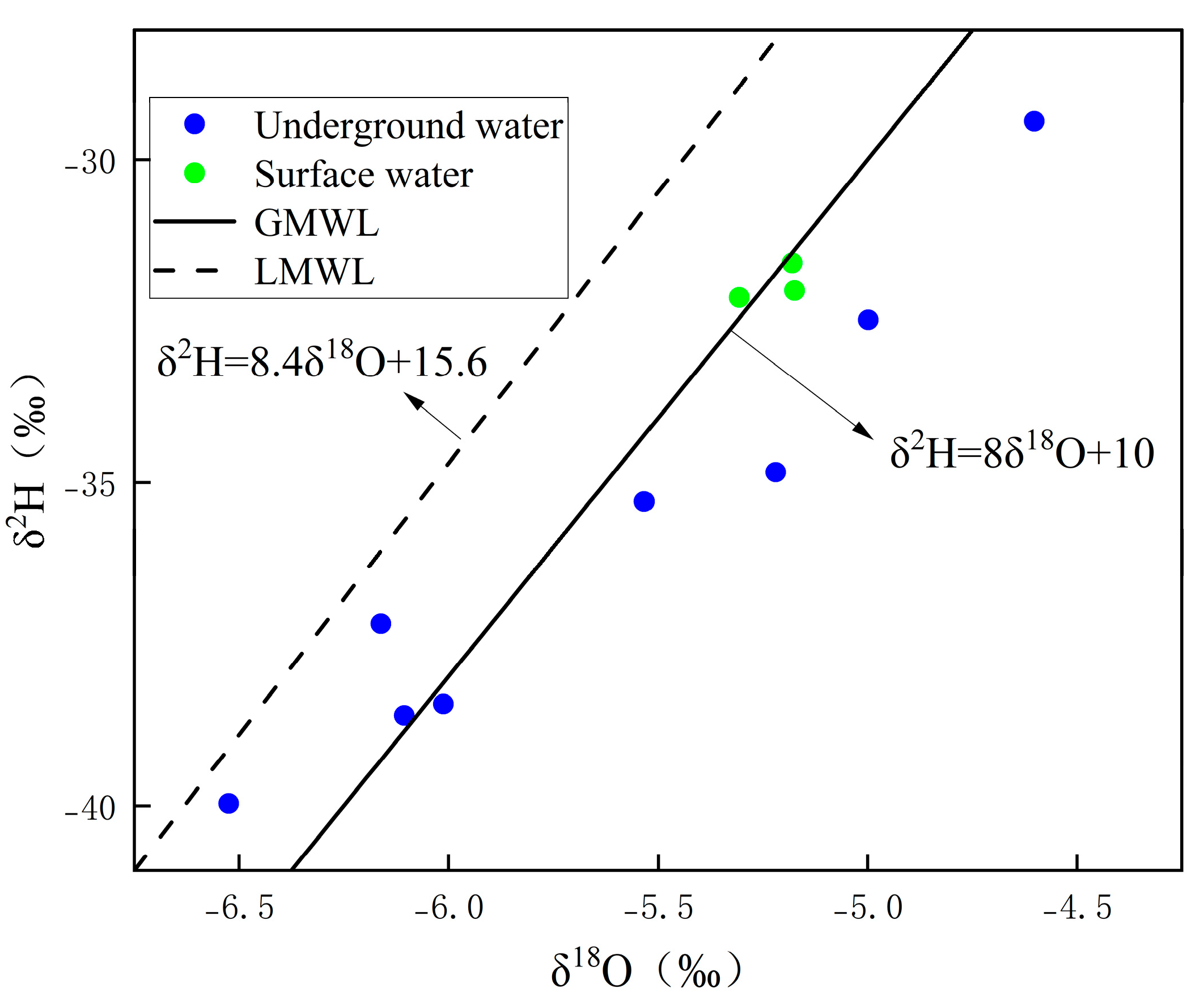 - Stable isotopic (18O and δ2H) analyses show that both surface water and groundwater share a common recharge source—atmospheric precipitation. However, surface water showed greater isotopic enrichment owing to enhanced evaporation during its exposure to the atmosphere. Tritium (3H) dating results suggest that the groundwater in the study area has a residence time of approximately 60 years, reflecting long-term water–rock interactions and significant hydrogeochemical evolution.