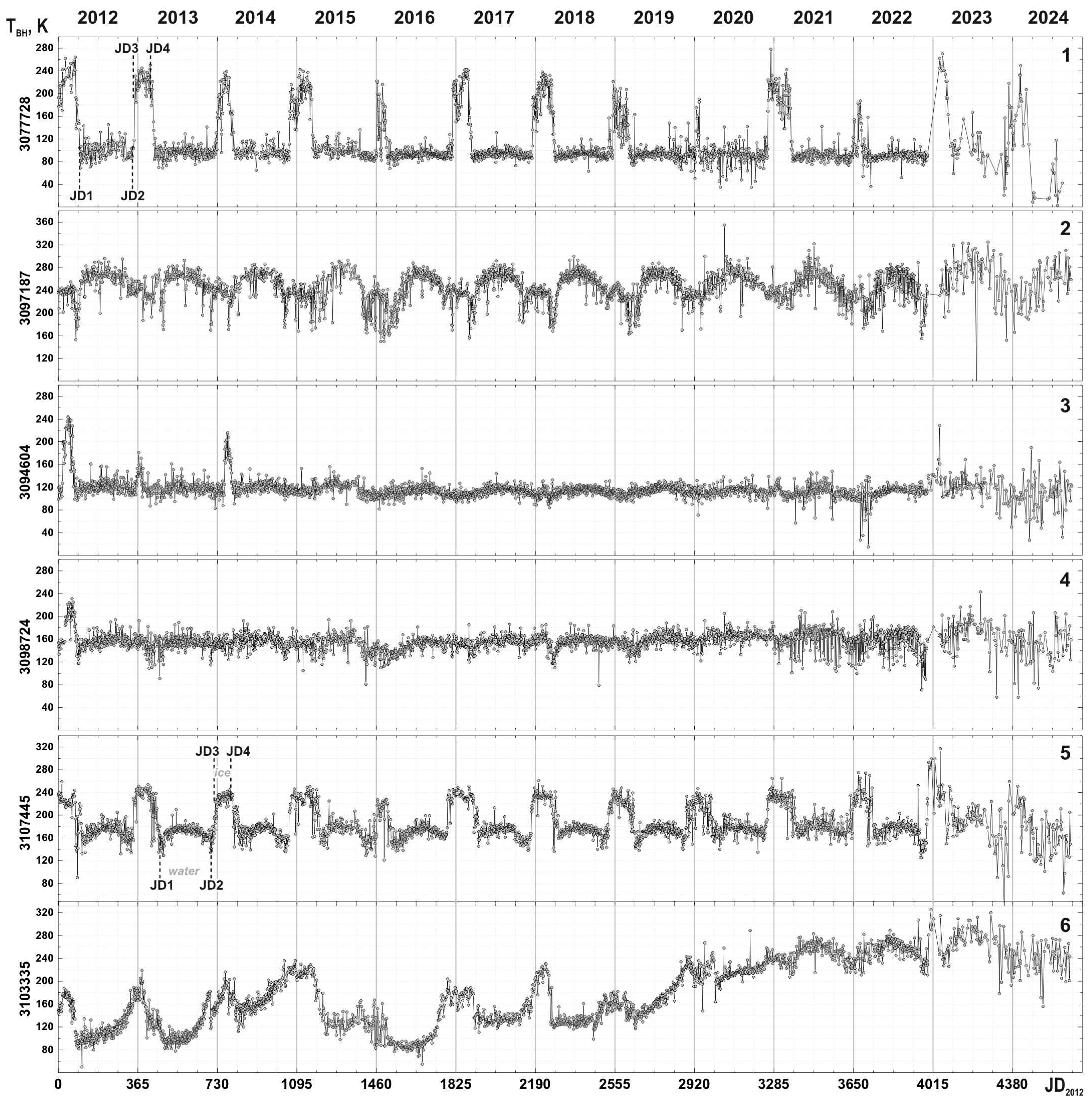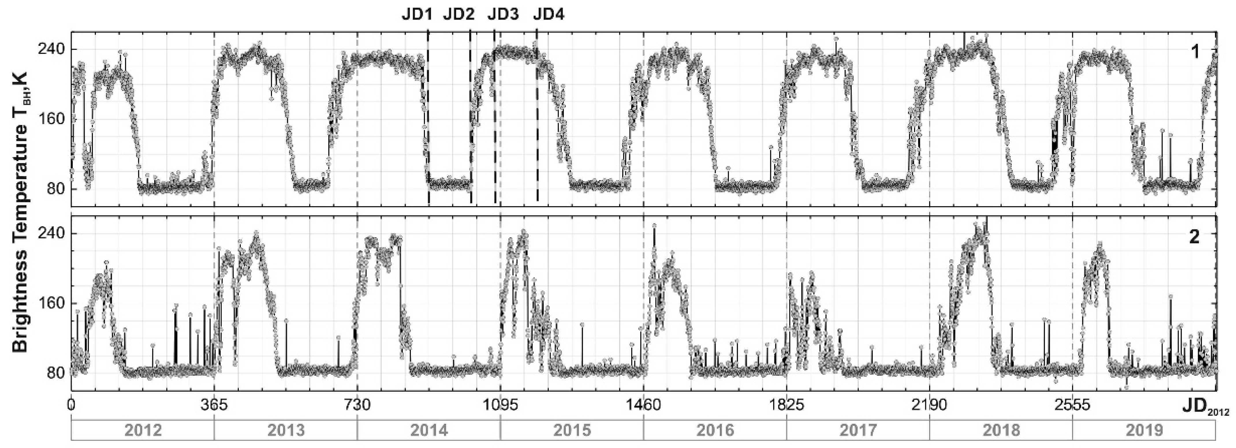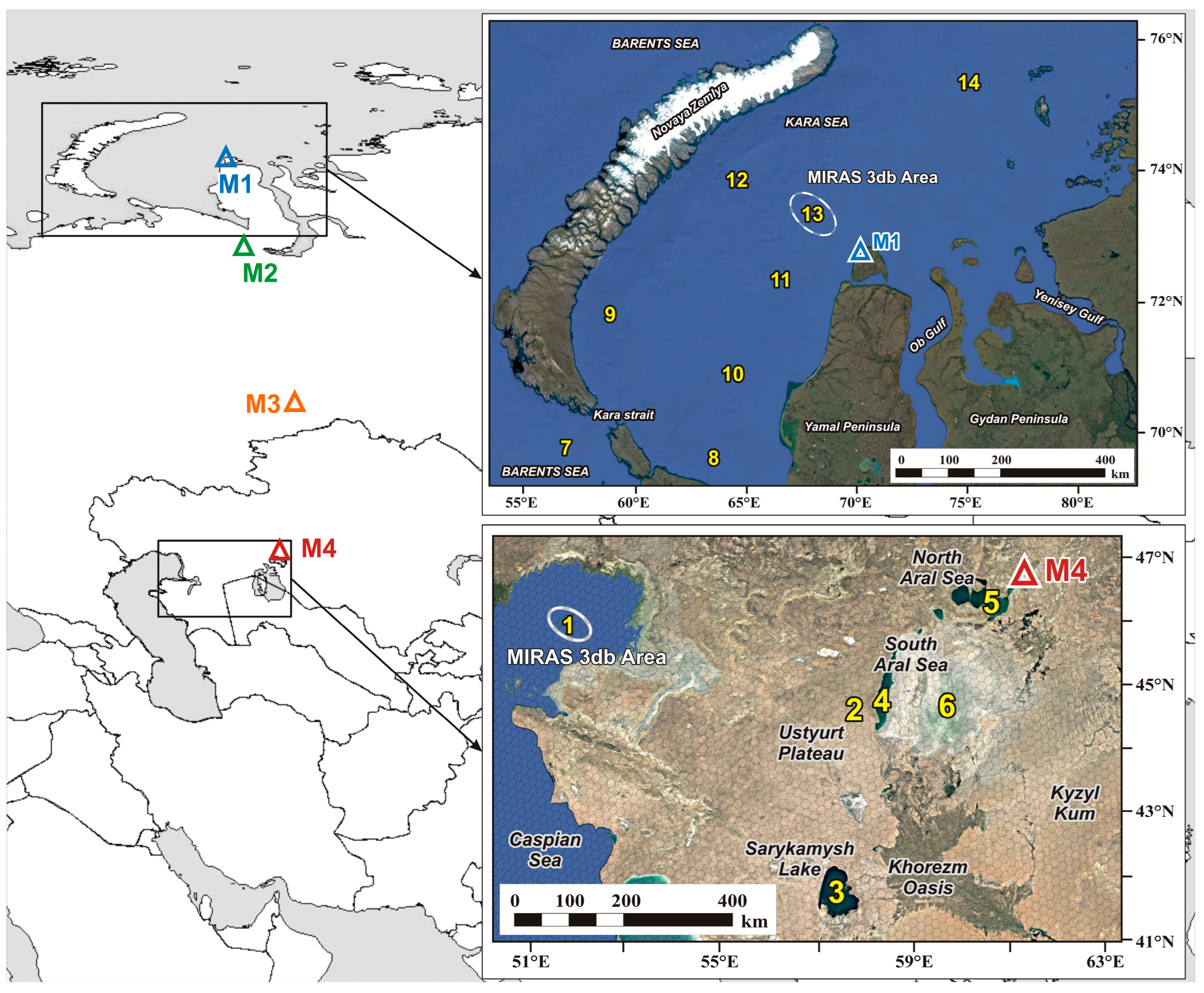 - The studied long-term seasonal dynamics of the brightness temperature (L-band) of the underlying surface for test sites in the catastrophically shriveled Aral Sea and the resulting Aralkum Desert indicate ongoing aridization of the area.