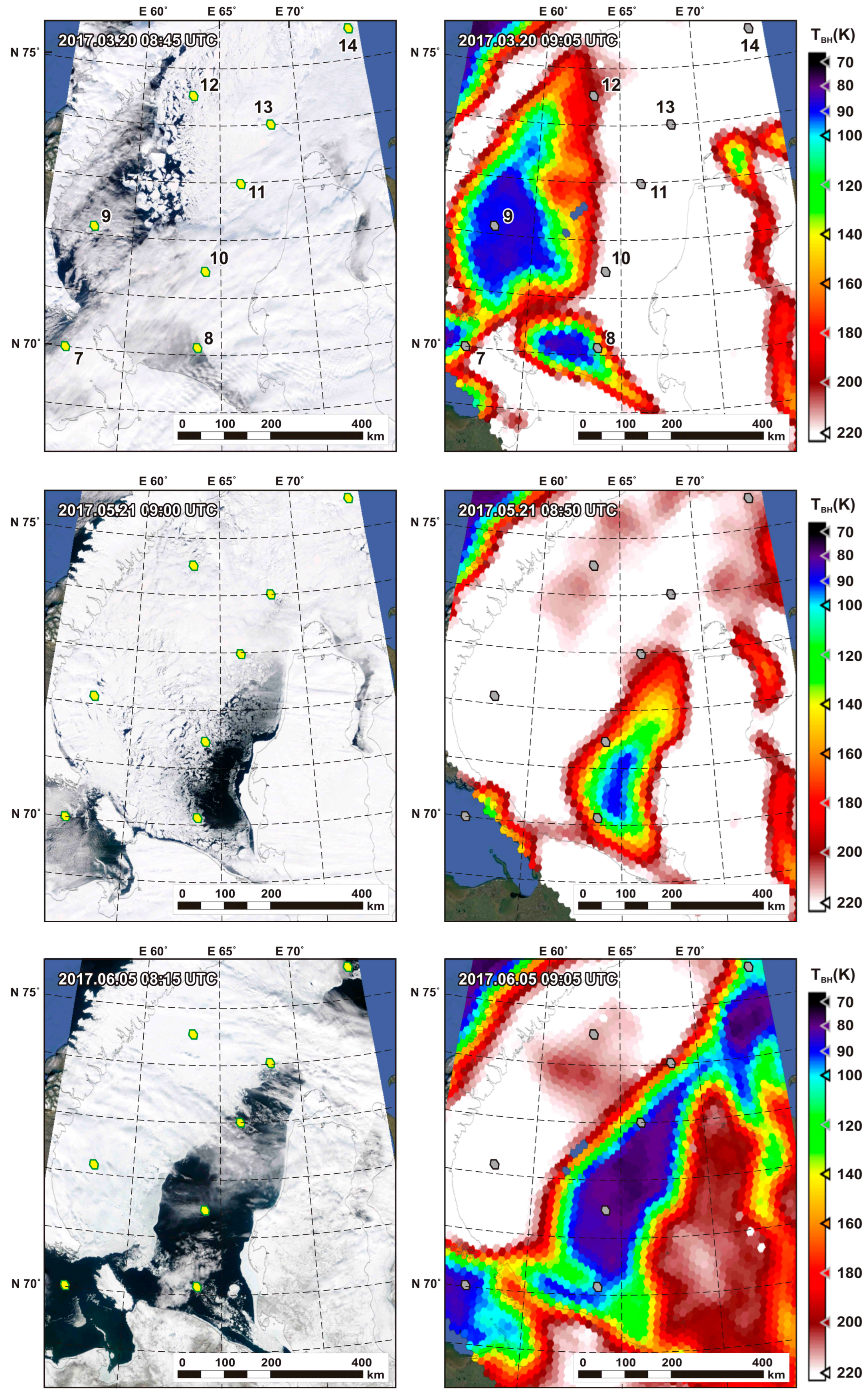 - Romanov, A.N.; Khvostov, I.V.; Ryabinin, I.V.; Tikhonov, V.V.; Sharkov, E.A. Seasonal and Interannual Dynamics of Radio Brightness Temperatures in the Waters of the Eastern Seas of the Arctic Ocean. 2021. Available online: http://conf.rse.geosmis.ru/files/books/2021/8716.htm (accessed on 25 December 2025).