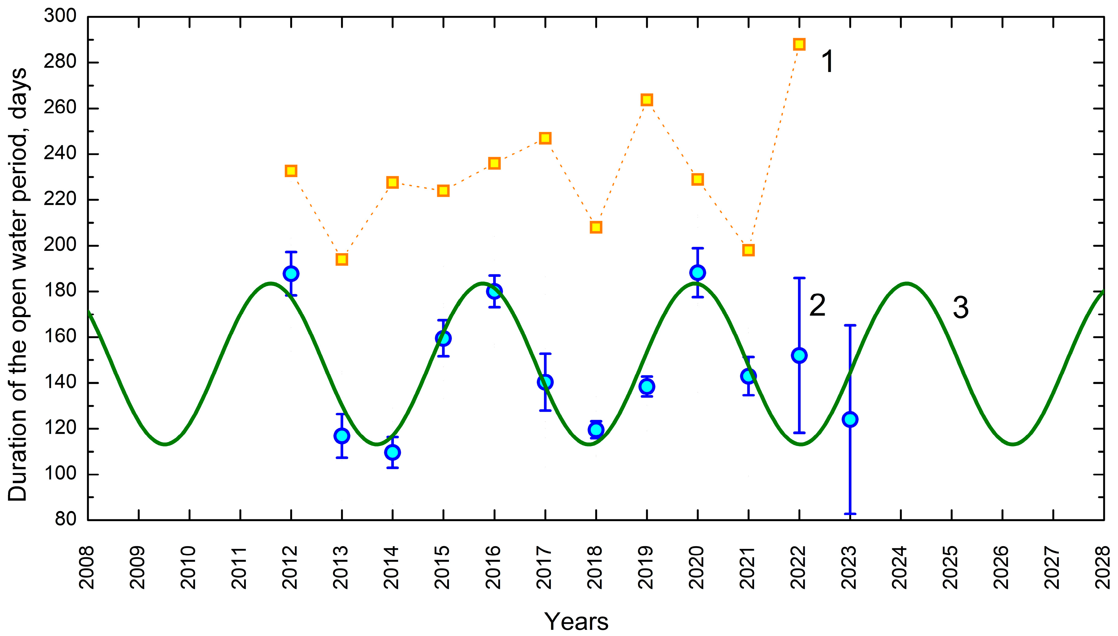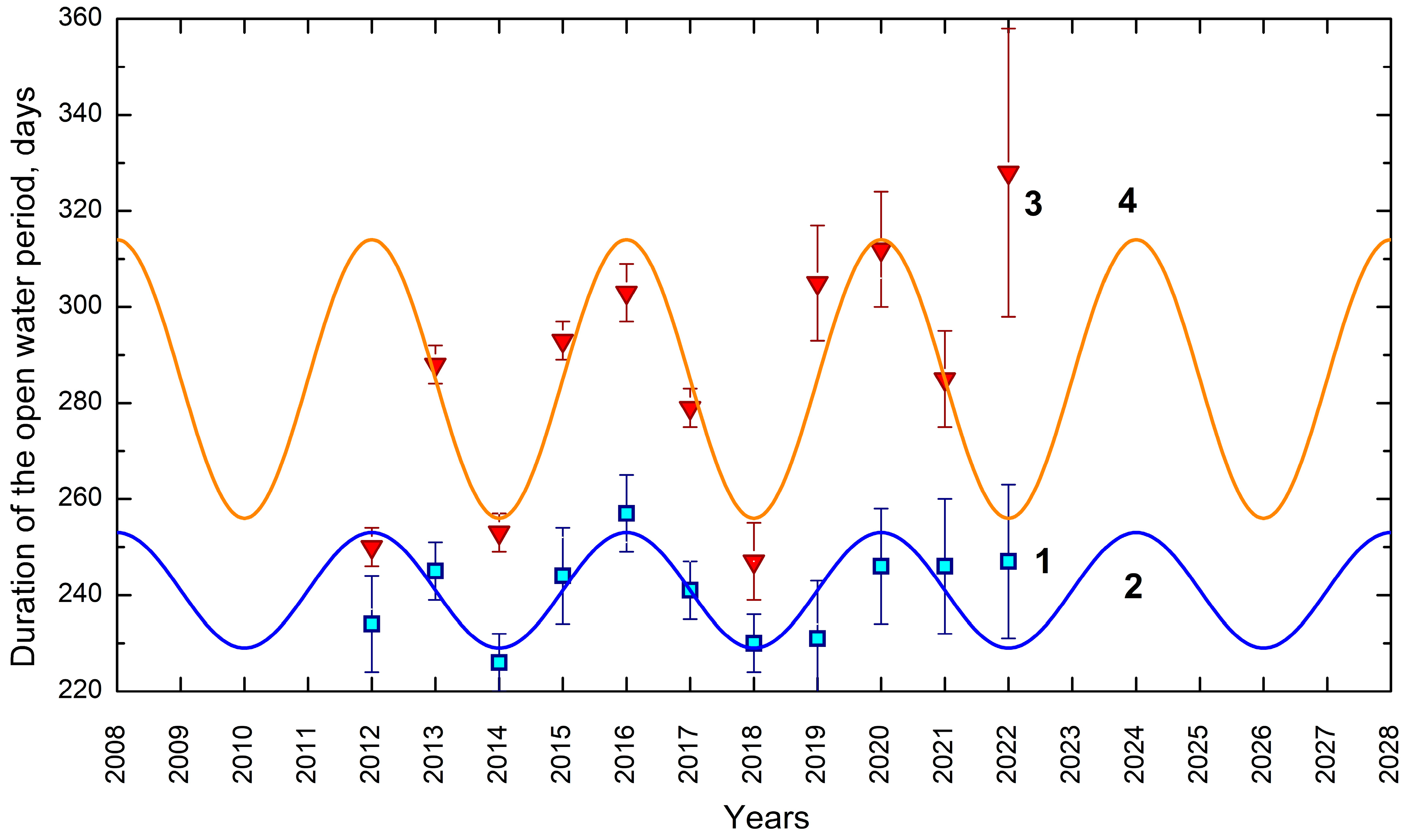 - Murmansk Marine Biological Institute of the Russian Academy of Sciences; Bulavina, A.S. The Effect of Fluctuations of the Ob and Yenisei Rivers Runoff on the Area of the Kara Sea Ice Cover. TKSC RAS NSH 2023, 2, 10–18. [Google Scholar] [CrossRef]