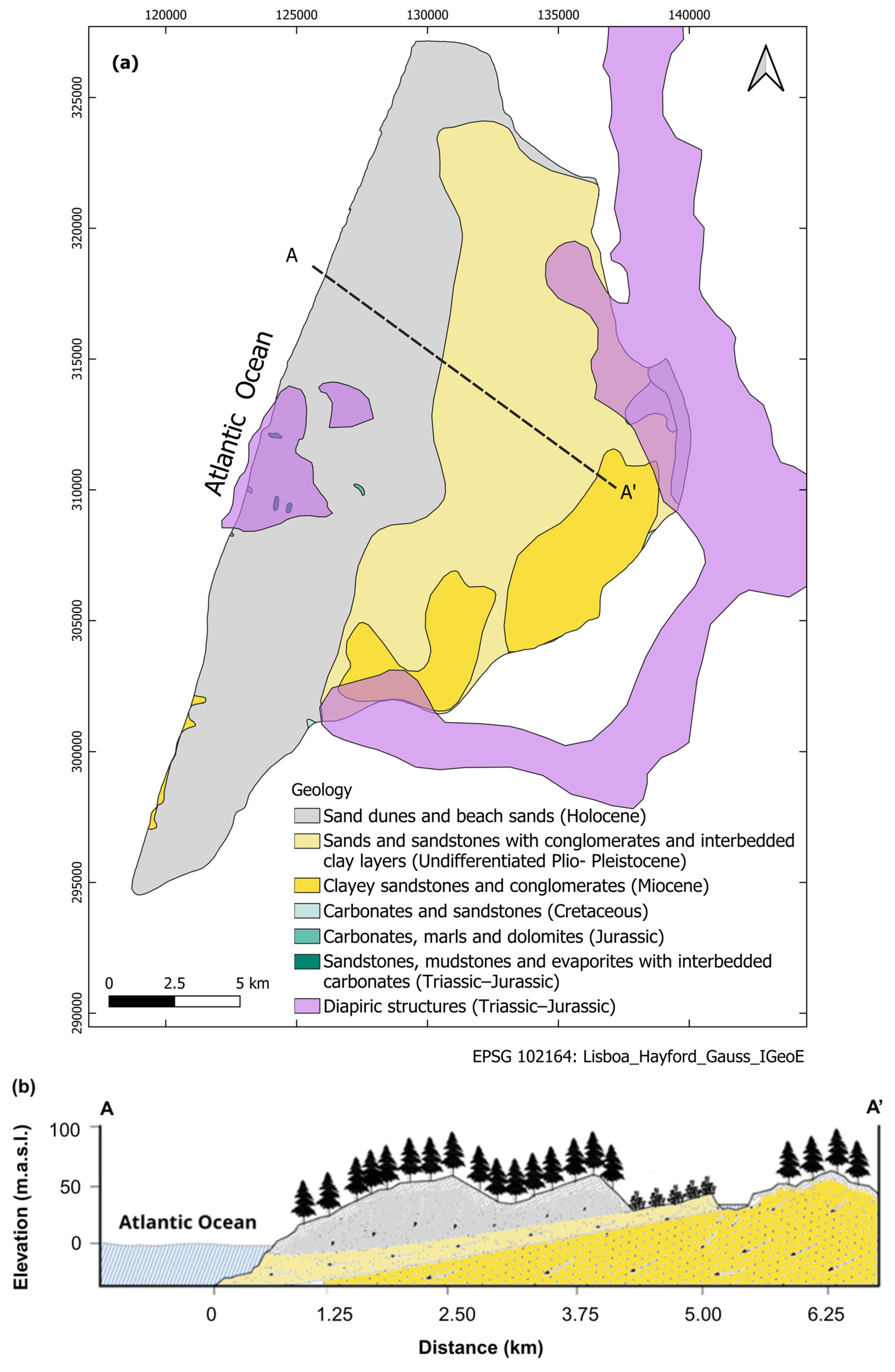- Undifferentiated Plio-Pleistocene: Composed of fine- to medium-grained sands with conglomeratic horizons and clay intercalations. Thickness ranges from less than 20 m close to São Pedro de Moel to more than 150 m towards southeast. Hydraulic conditions vary from semi-confined to confined.