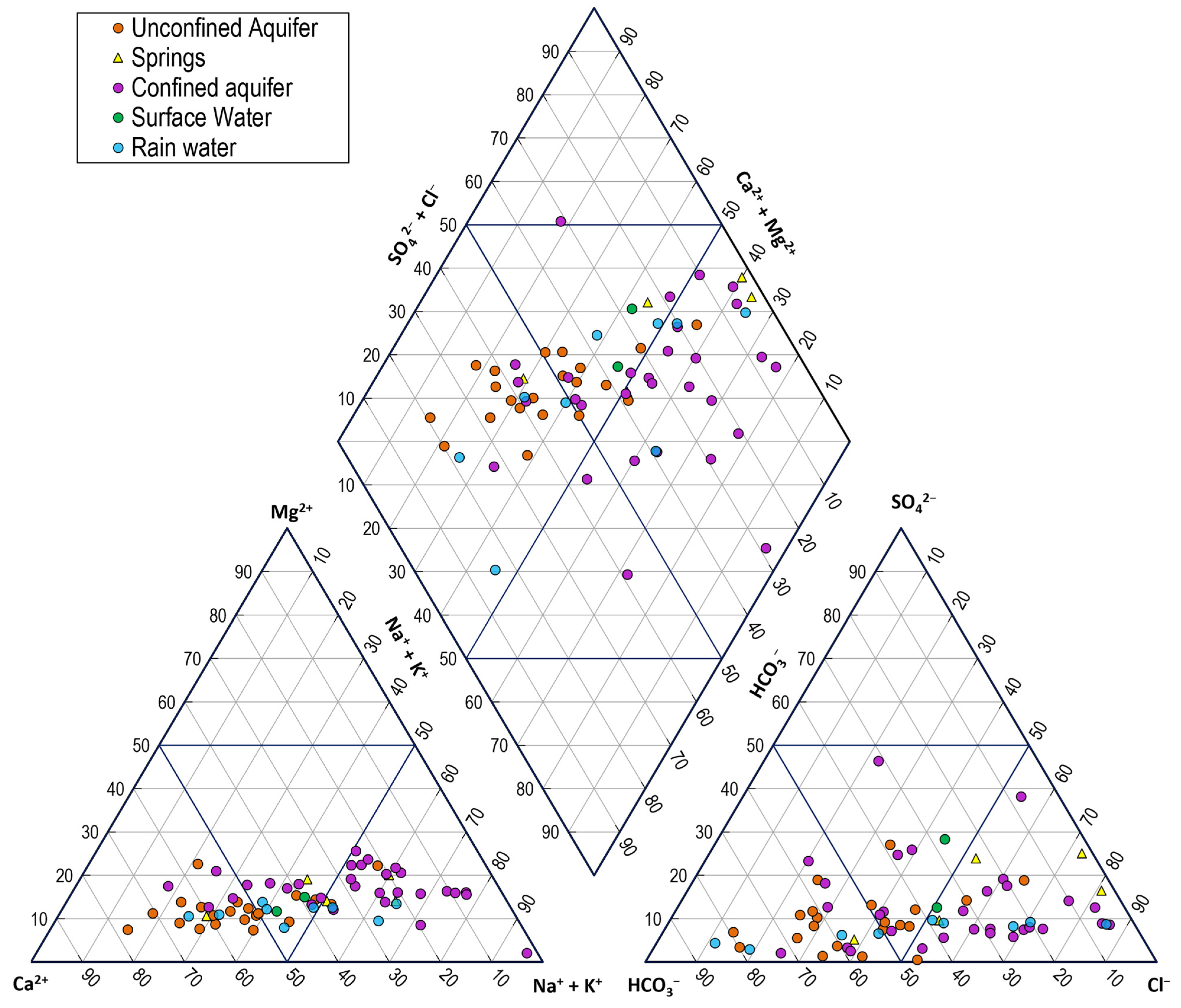 | Confined Aquifer (n = 29) | MIN | 5.09 | 15.41 | 122 | 290 | 0.00 | 0.78 | 0.08 | 0.05 | 0.07 | 0.07 | 0.50 | 0.07 |