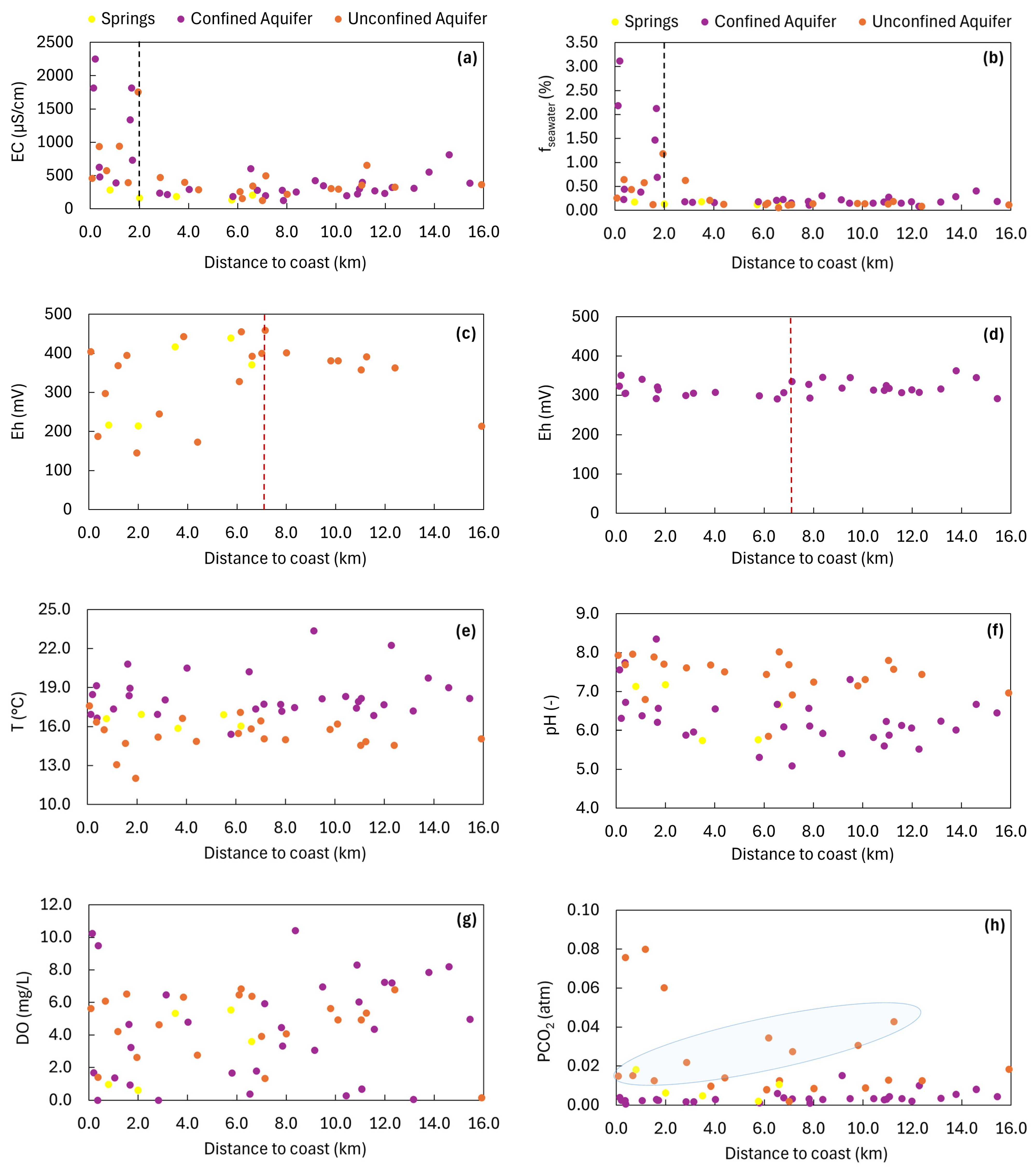 - Holocene: Consists of unconsolidated coastal sand dunes forming an unconfined porous aquifer parallel to the coast, with thickness exceeding 50 m in some areas. This unit shows hydraulic conductivities between 10 and 30 m day−1, groundwater level depth between 2 and 4 m, and it is mainly recharged by direct infiltration of precipitation.