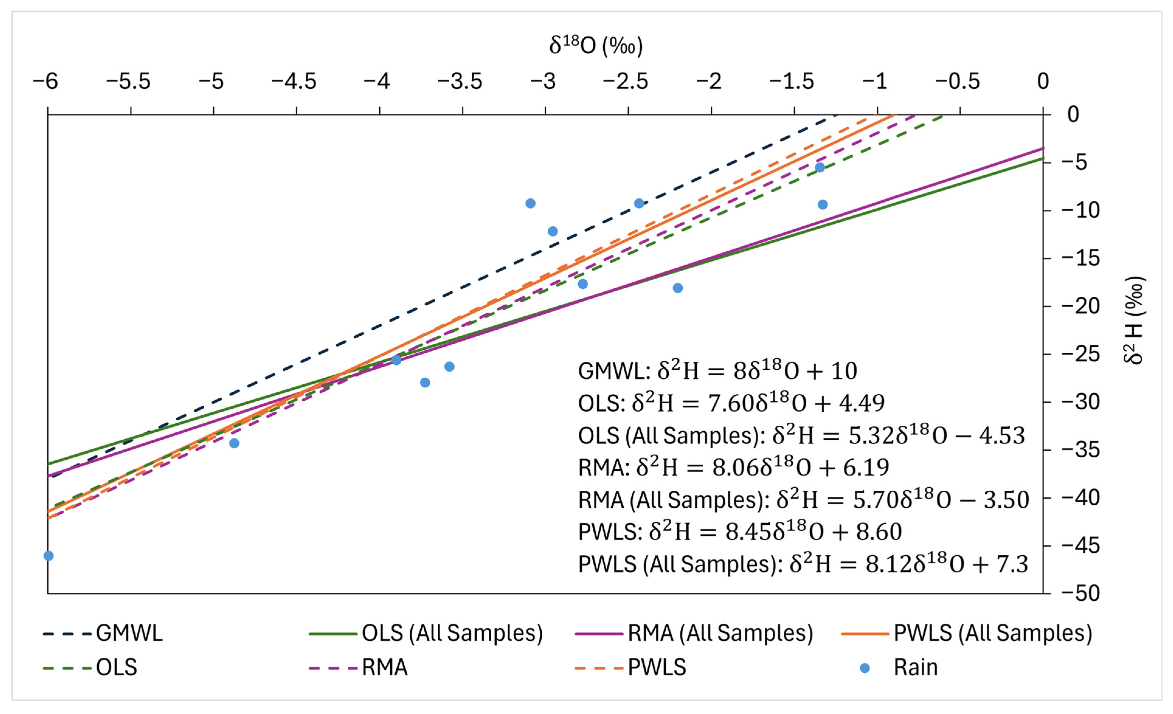 - Crawford, J.; Hughes, C.E.; Lykoudis, S. Alternative Least Squares Methods for Determining the Meteoric Water Line, Demonstrated Using GNIP Data. J. Hydrol. 2014, 519, 2331–2340. [Google Scholar] [CrossRef]