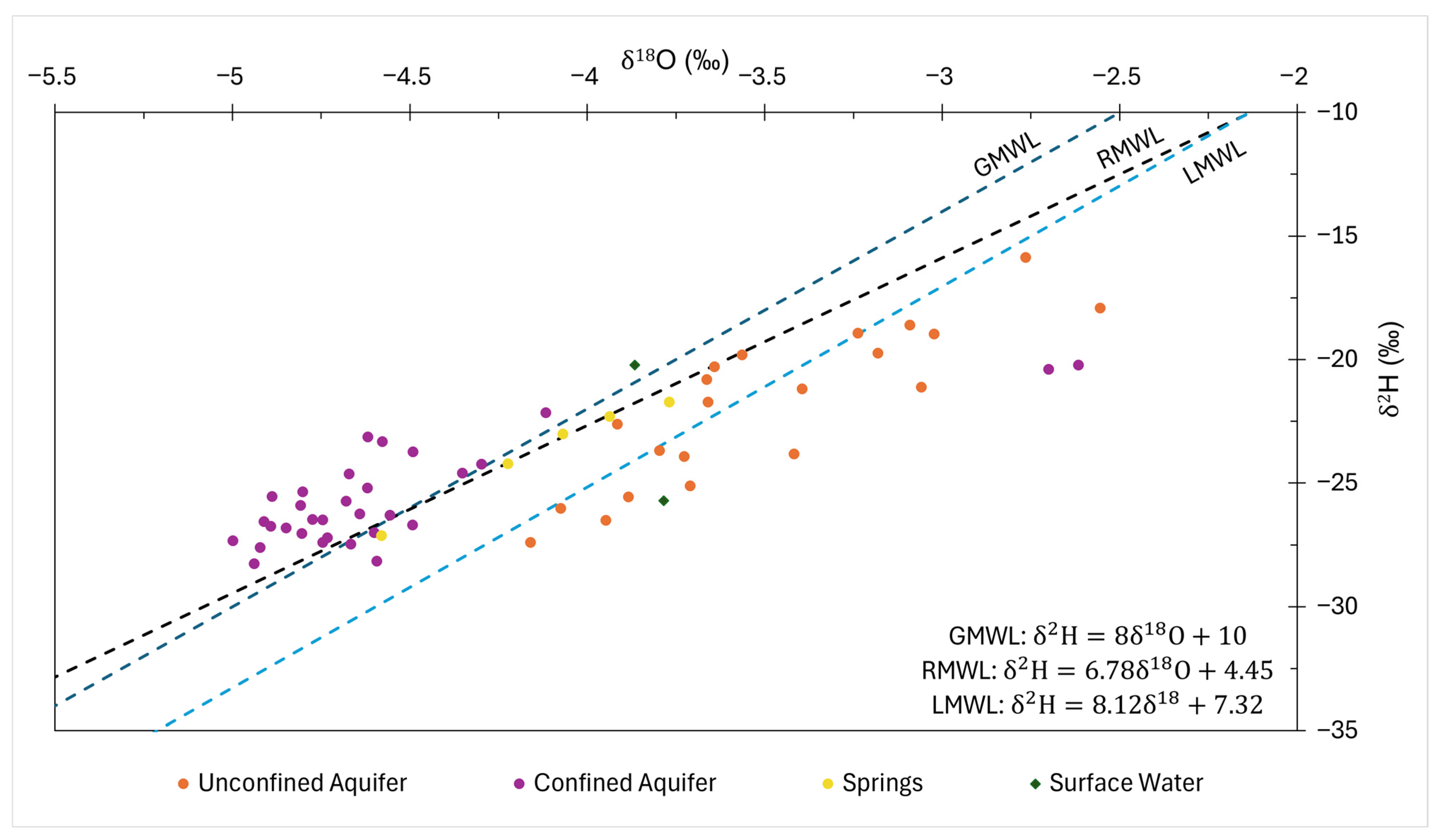 - Diamond, R.E. Stable Isotope Hydrology; Kalin, R., Poeter, E., Cherry, J., Eds.; The Groundwater Project: Guelph, ON, Canada, 2022; ISBN 978-1-77470-043-3. [Google Scholar]