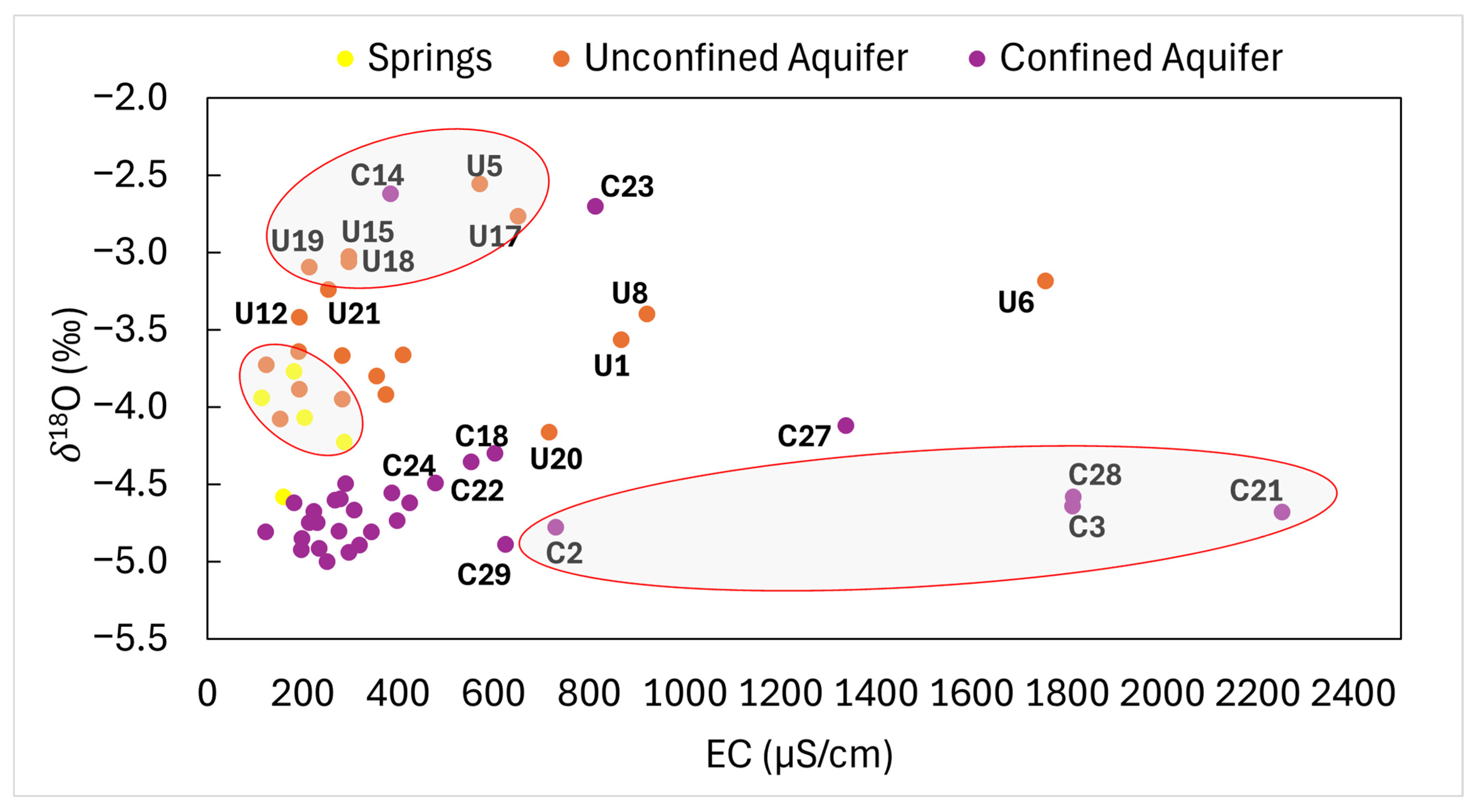 - Eid, M.H.; Eissa, M.; Mohamed, E.A.; Ramadan, H.S.; Czuppon, G.; Kovács, A.; Szűcs, P. Application of Stable Isotopes, Mixing Models, and K-Means Cluster Analysis to Detect Recharge and Salinity Origins in Siwa Oasis, Egypt. Groundw. Sustain. Dev. 2024, 25, 101124. [Google Scholar] [CrossRef]