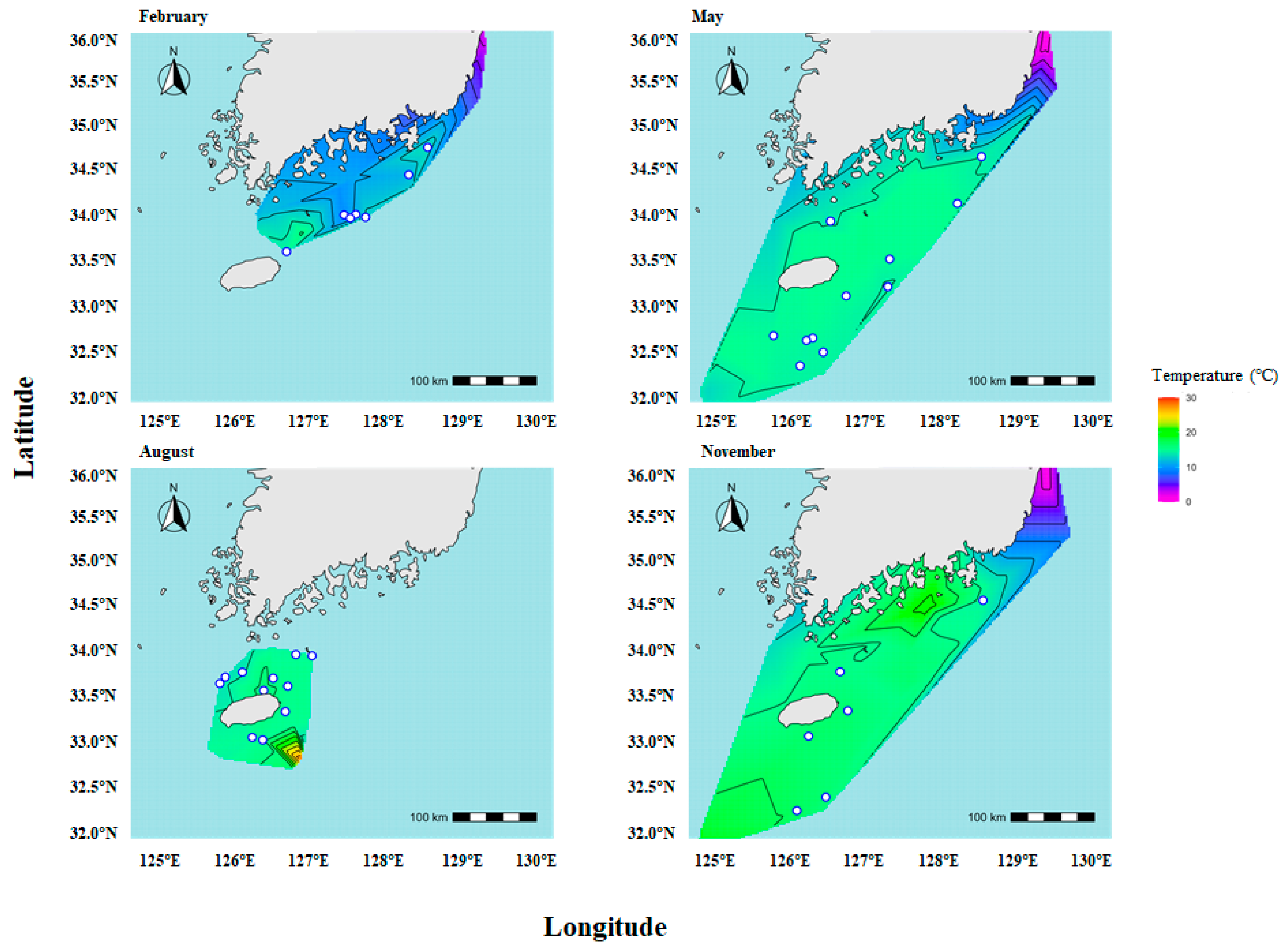 - Park, H.S.; Song, S.H.; Jeong, J.M.; Yang, J.H.; Kim, C.S. Comparison of the feeding characteristics of chub mackerel Scomber japonicus in Jeju Island and the Yellow Sea of Korea. Water 2025, 17, 1804. [Google Scholar] [CrossRef]