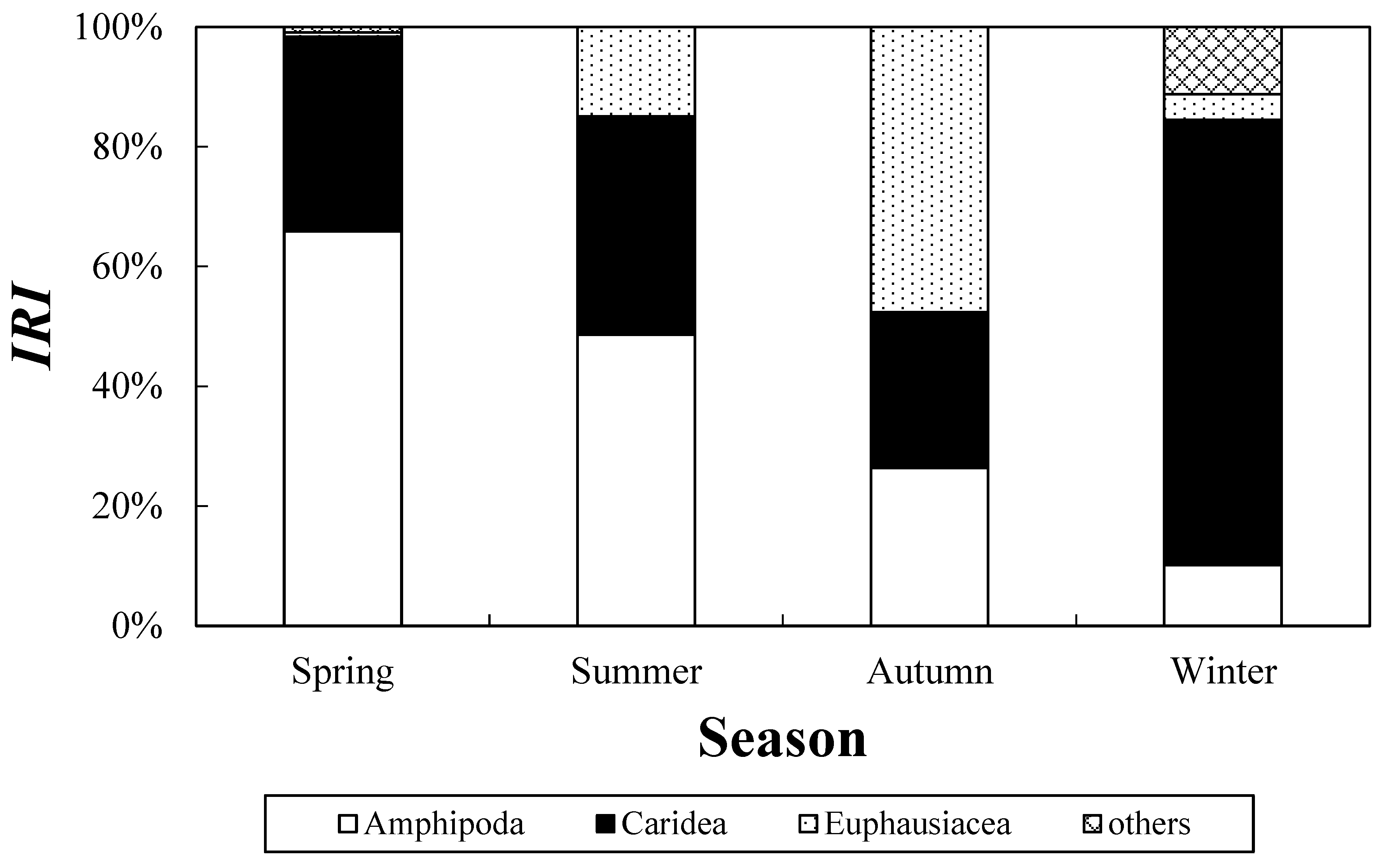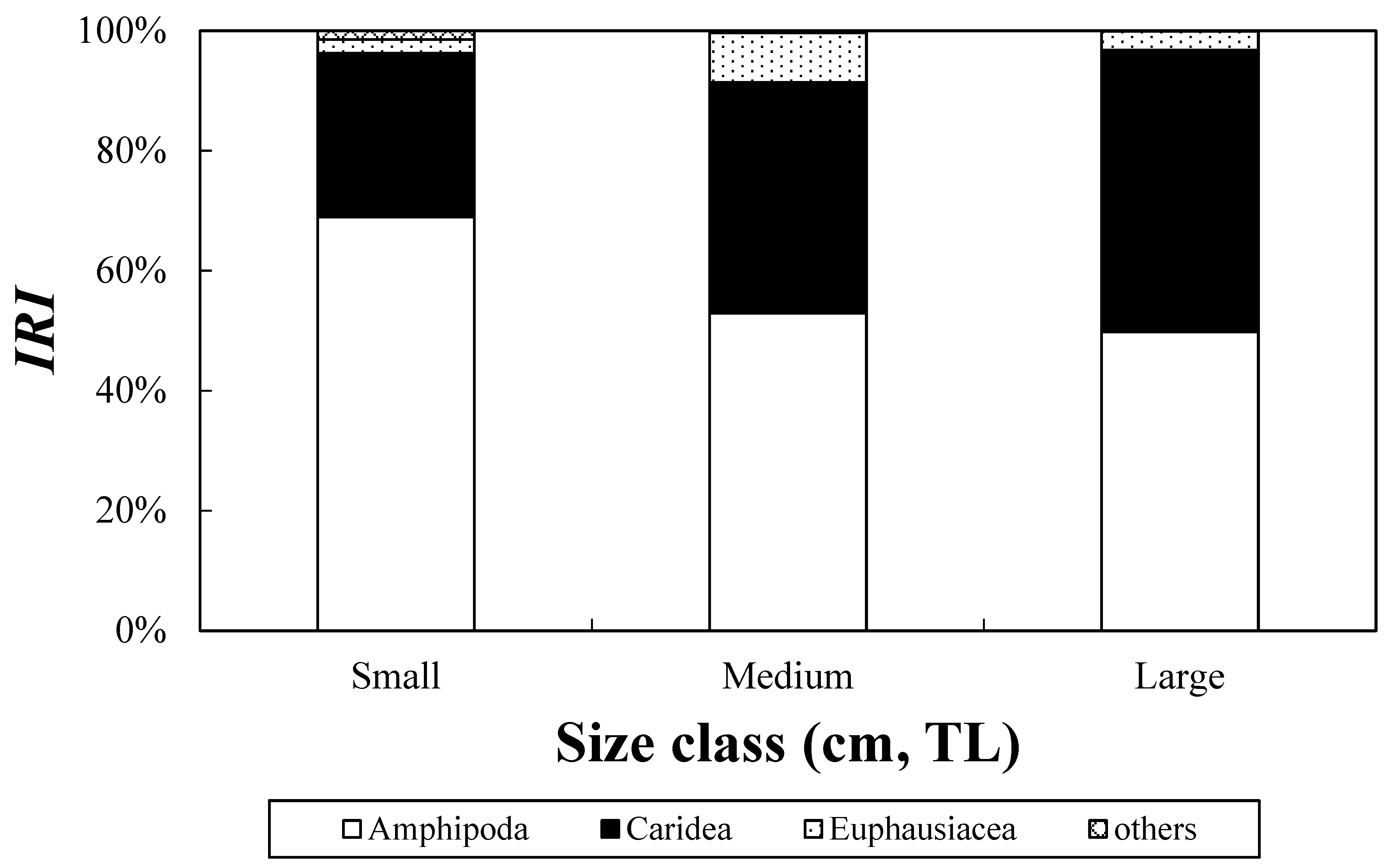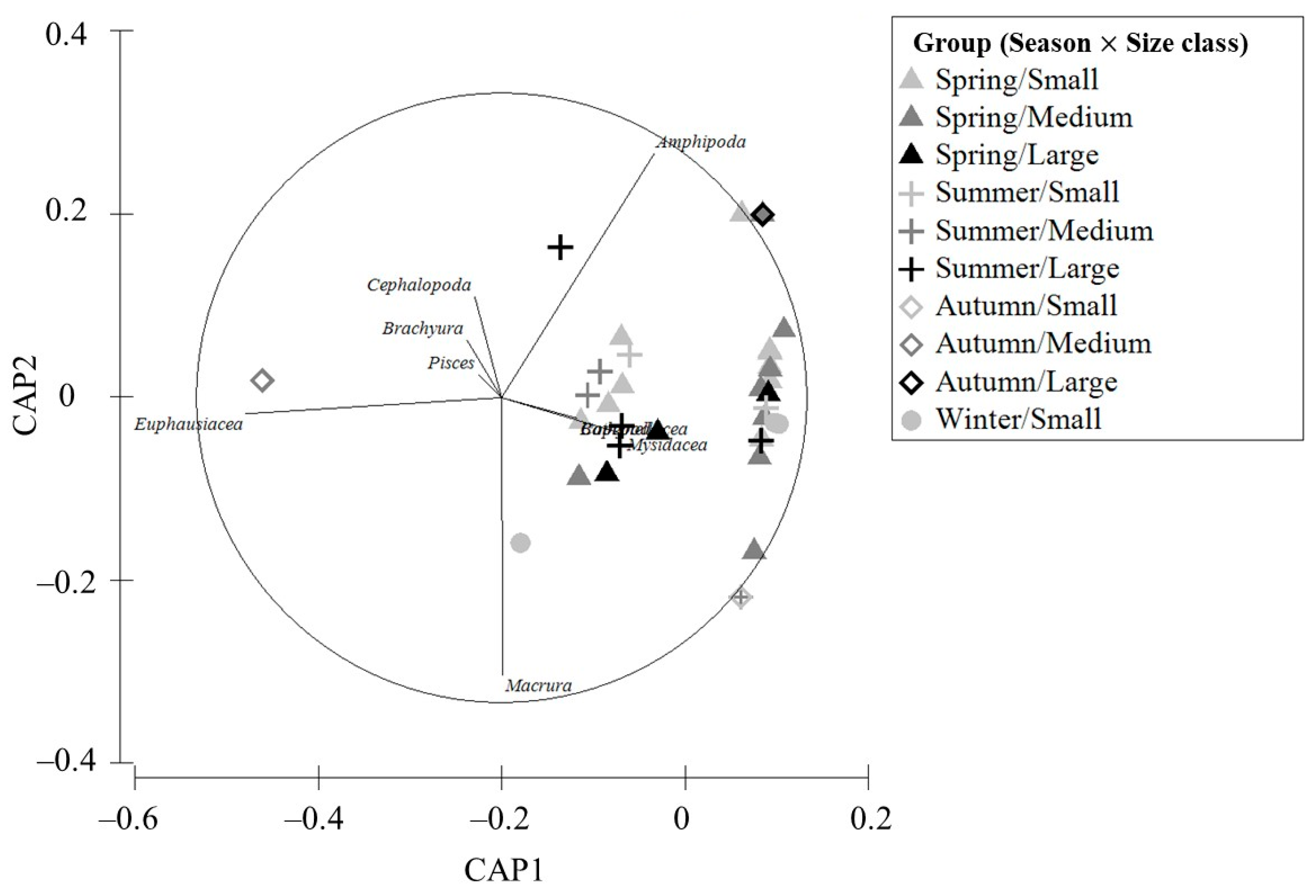 3.6. Analysis of Feeding Patterns Based on Size Class and Season