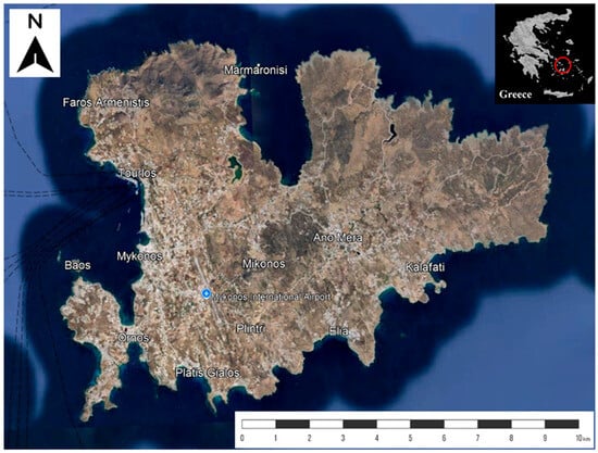 Located in Greece, Mykonos (37°24′–37°30′ N, 25°17′–25°30′ E) is an island in the Aegean Sea and part of the Cyclades complex (Figure 1). Its capital, Chora, lies on the western side of the island. According to the 2021 Census of the Hellenic Statistical Authority [23], Mykonos has a population of 10,704 permanent residents. The island covers an area of 86 km2 and has a coastline of about 89 km [24]. The port of Mykonos is located 117 km from Piraeus, the main port of Greece. Nearby islands include Tinos (9 km), Syros (29 km), Paros (28 km), and Naxos (26 km).