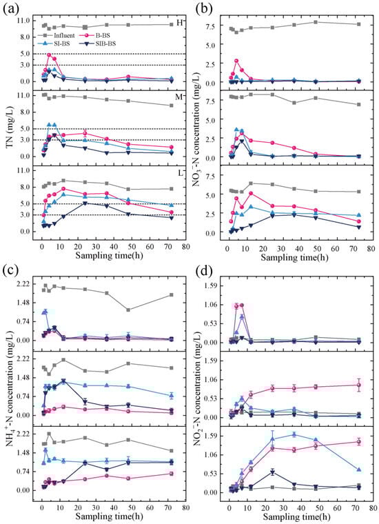 Nitrogen removal performance of B-BS, SI-BS, and SIB-BS under continuous inflow and varying temperature conditions: (a) TN, (b) NO3−-N, (c) NH4+-N, and (d) NO2−-N. All figures present nitrogen concentrations (influent vs. effluent) in sequential order from top to bottom: H means high temperature (24.5–26.3 °C), M means medium temperature (16.5–17.3 °C), and L means low temperature (8.0–12.8 °C), within each panel, data are arranged from top to bottom as H, M, and L.