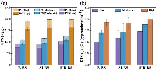 To reveal the impact of the relationship between EPS and ETSA on nitrogen removal in bioretention systems, the EPS and ETSA content in these systems were analyzed (Figure 4). As the water temperature increased, the EPS content showed an upward trend. The PN of SIB-BS at low temperature was significantly higher at 1226.95 μg/g compared to B-BS (1075.24 μg/g) and SI-BS (1045.70 μg/g) (p < 0.05). At high temperature, the PN and PS of the three bioretention systems reached their highest levels, but the differences were not significant. The non-significant change in PS for the iron-containing systems (SI-BS and SIB-BS) at high temperature may indicate that polysaccharides, as a major structural fraction of EPS, reached a relatively stable level once mature biofilms were established [36]. Moreover, the presence of Fe(II)/Fe(III) can promote EPS bridging and complexation with iron (hydr)oxides [37], which may reduce the extractable/free PS fraction and thus lead to comparable measured PS values despite enhanced overall microbial activity. The ETSA variation pattern was similar to that of EPS; with increasing water temperature, ETSA in the bioretention systems also showed an upward trend. SIB-BS consistently maintained the highest value, especially under low temperature conditions, where SIB-BS (0.6 ± 0.1 μgO2·(g·protein·min)−1) was significantly higher than B-BS (0.42 ± 0.1 μgO2·(g·protein·min)−1) and SI-BS (0.5 ± 0.1 μgO2·(g·protein·min)−1) (p < 0.05).