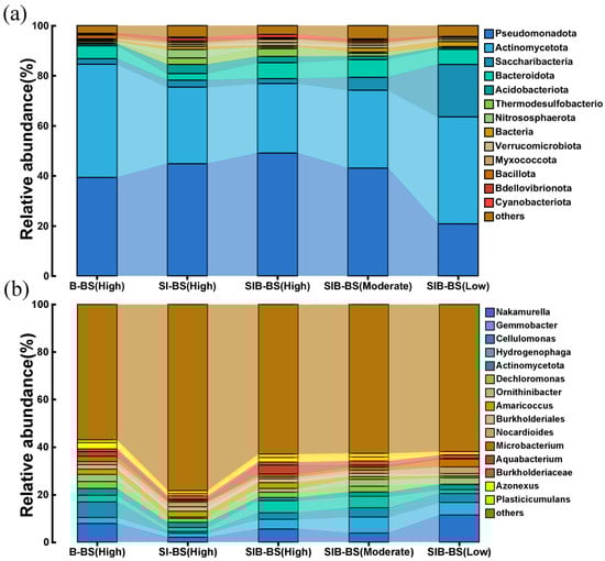 Microbial community structure in bioretention systems (a) relative abundance at the phylum level (b) relative richness at the genus level. The abundance of microbial communities in three sets of bioretention systems was measured at high temperatures to compare microbial community structure between the systems. SIB-BS was measured at three temperatures to compare microbial community structure.