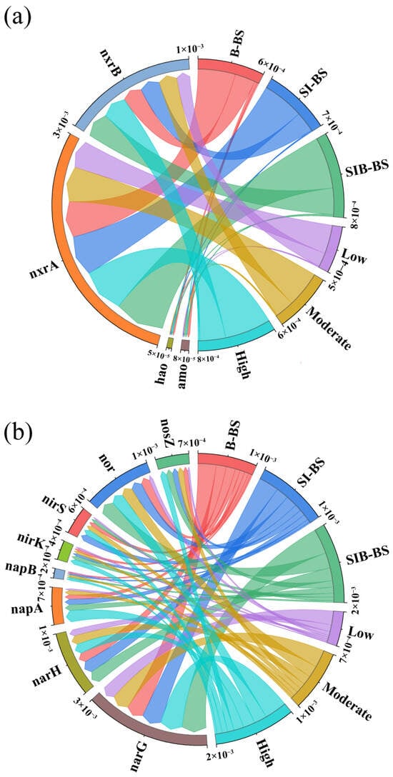 Analysis of gene abundance of nitrogen metabolism pathway in bioretention systems: (a) Nitrification gene abundance; (b) Denitrification gene abundance.
