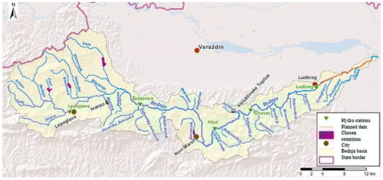 The Bednja River is the right tributary of the Drava River, which springs from smaller streams at an elevation of 300 m and maintains a constant flow at the foot of Macelj, near Brezova Gora in the northwest part of Croatia. It should be emphasized that the Bednja is the longest river in Croatia with a source and estuary in the same country [53]. Figure 7 shows the water catchment with the tributaries of the Bednja River [53,54]. The Bednja flows into the Drava River near Mali Bukovec (at an elevation of 136 m) and is 133 km long, with a basin area of 596 km2 [55]. In the Bednja basin, three relief units stand out: alluvial plain, tertiary mountains, and Paleozoic mountains.