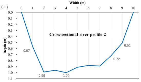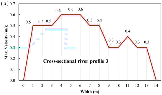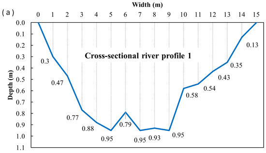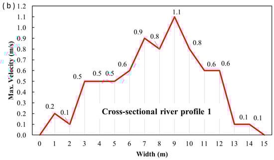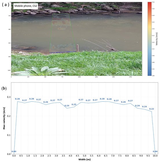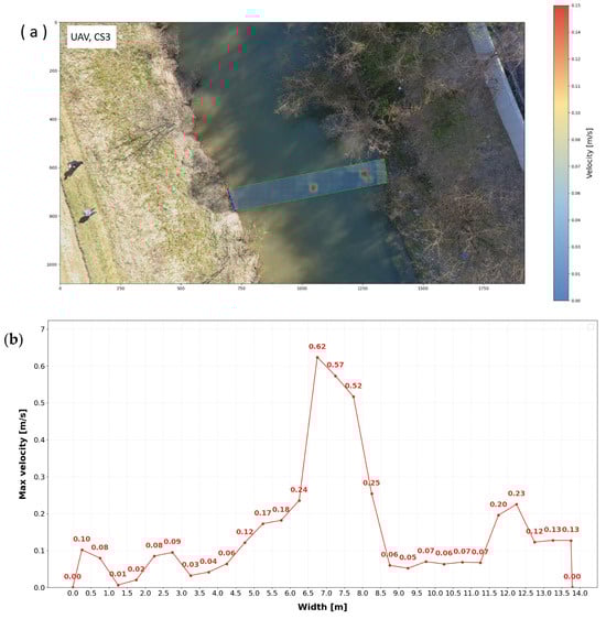 Fieldwork was conducted on 18 April 2025. The depth profiles and maximum surface velocities for the specified cross profiles (CS1, CS2, and CS3) were obtained using three different methods: mobile phone measurements, UAV-based measurements, and PCM measurements. The data collected during the field surveys are presented in the following figures, illustrating the results of measurements conducted at the specified cross profiles. Figure 9, Figure 10, Figure 11, Figure 12, Figure 13, Figure 14, Figure 15, Figure 16 and Figure 17 present the results for cross profiles CS1, CS2, and CS3 obtained using PCM, UAV-based, and mobile phone measurements. The figures include depth profiles, surface velocity fields, and distributions of maximum surface velocities across the channel width. Figure 9, Figure 12 and Figure 15 collectively present the depth profiles and surface velocity distributions for cross profiles CS1, CS2, and CS3. The depth profiles (a) illustrate the channel morphology at each cross-section, while the associated distributions of maximum surface velocities (b) were obtained from PCM measurements. Figure 10, Figure 13 and Figure 16 collectively present UAV-derived velocity fields for cross profiles CS1, CS2, and CS3. Each figure includes the aerial layout of the measured surface velocities (a) and the associated distribution of maximum surface velocities across the channel width (b). Figure 11, Figure 14 and Figure 17 collectively present mobile-phone-derived velocity fields for cross profiles CS1, CS2, and CS3, showing the measured surface velocities (a) and the corresponding distributions of maximum surface velocities across the channel width (b).