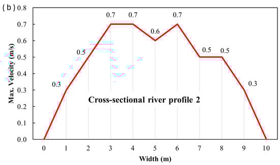 This research focuses on determining the surface velocities of the measured cross profiles. To this end, effective methods for determining surface velocities are applied at different cross-sections. The Section 3 explains further details. Also, the study will outline the procedures for fieldwork in the event of inability to access the analyzed sites. Such an event is common during extensive flooding, water overflows, and when the water is not entered for velocity measurements. These extreme examples are shown in Figure 1a,b. It is worth noting that the recorded surface velocity will be used as input to the Entropy model to estimate the cross-sectional velocity distribution and flow discharge. This work will be the second part of the current research.