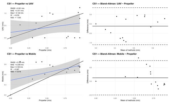 CS1 comparison with Propeller Current Meter: scatter plots (left) and Bland–Altman diagrams (right) for UAV (top) and mobile phone (bottom).