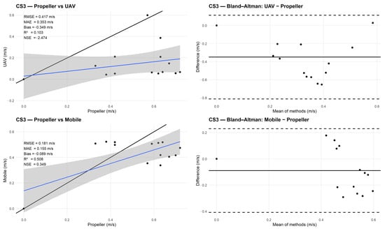 Scatter plots and Bland–Altman diagrams were prepared for all three cross-sections (CS1–CS3) to support the statistics reported in Table 2. In the scatter plots, points represent paired values at the propeller sampling locations (Propeller on the x-axis; UAV or Mobile on the y-axis). The black diagonal line indicates the 1:1 relationship (perfect agreement), while the blue line shows the fitted linear regression with a 95% confidence band. The Bland–Altman plots display the differences between methods relative to their means.