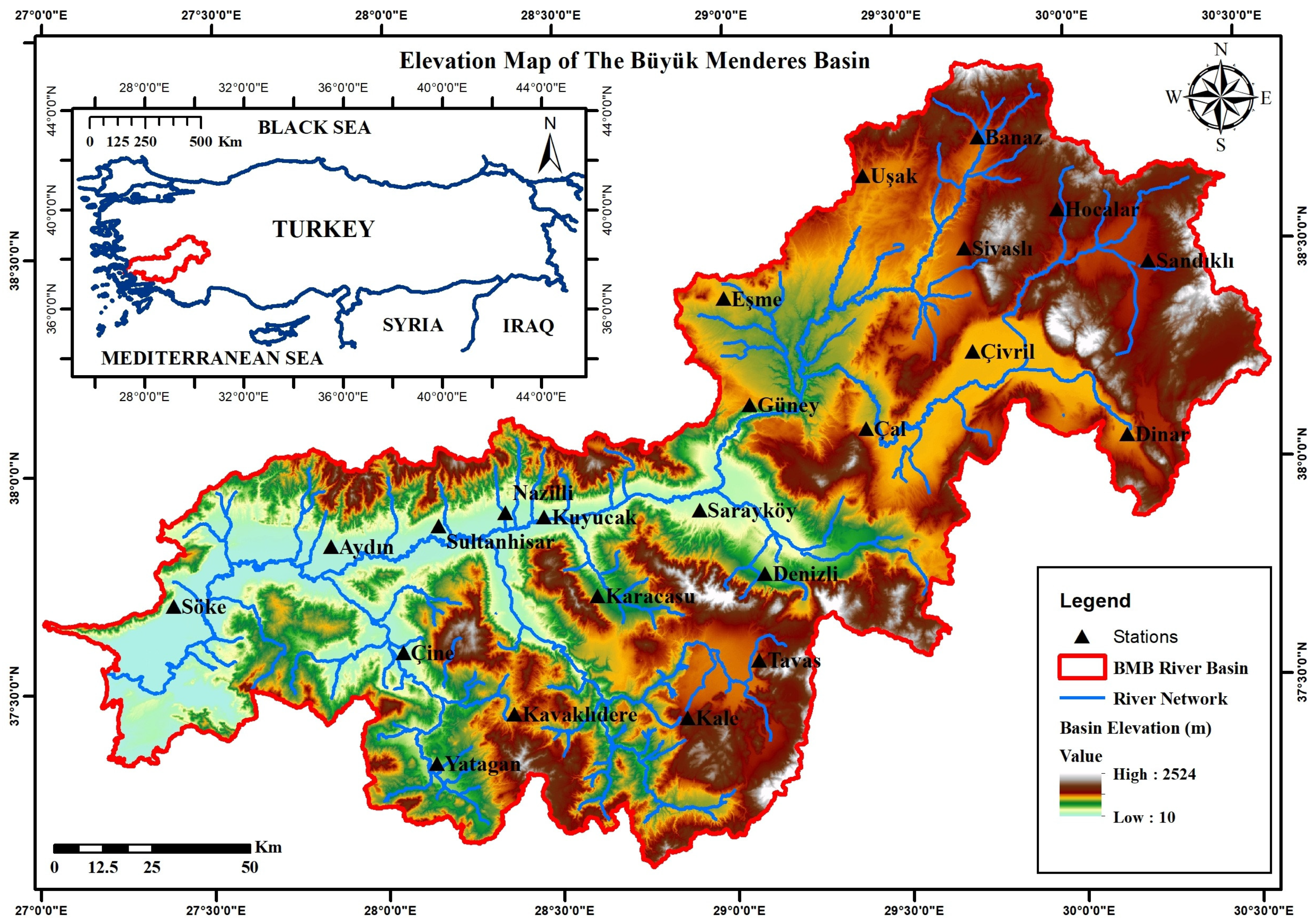 | Station 10 | Denizli | 562.9 | 555.7 | 539.7 | 526.2 | −7.1 | −23.2 | −36.6 | −1.27 | −4.12 | −6.51 |
