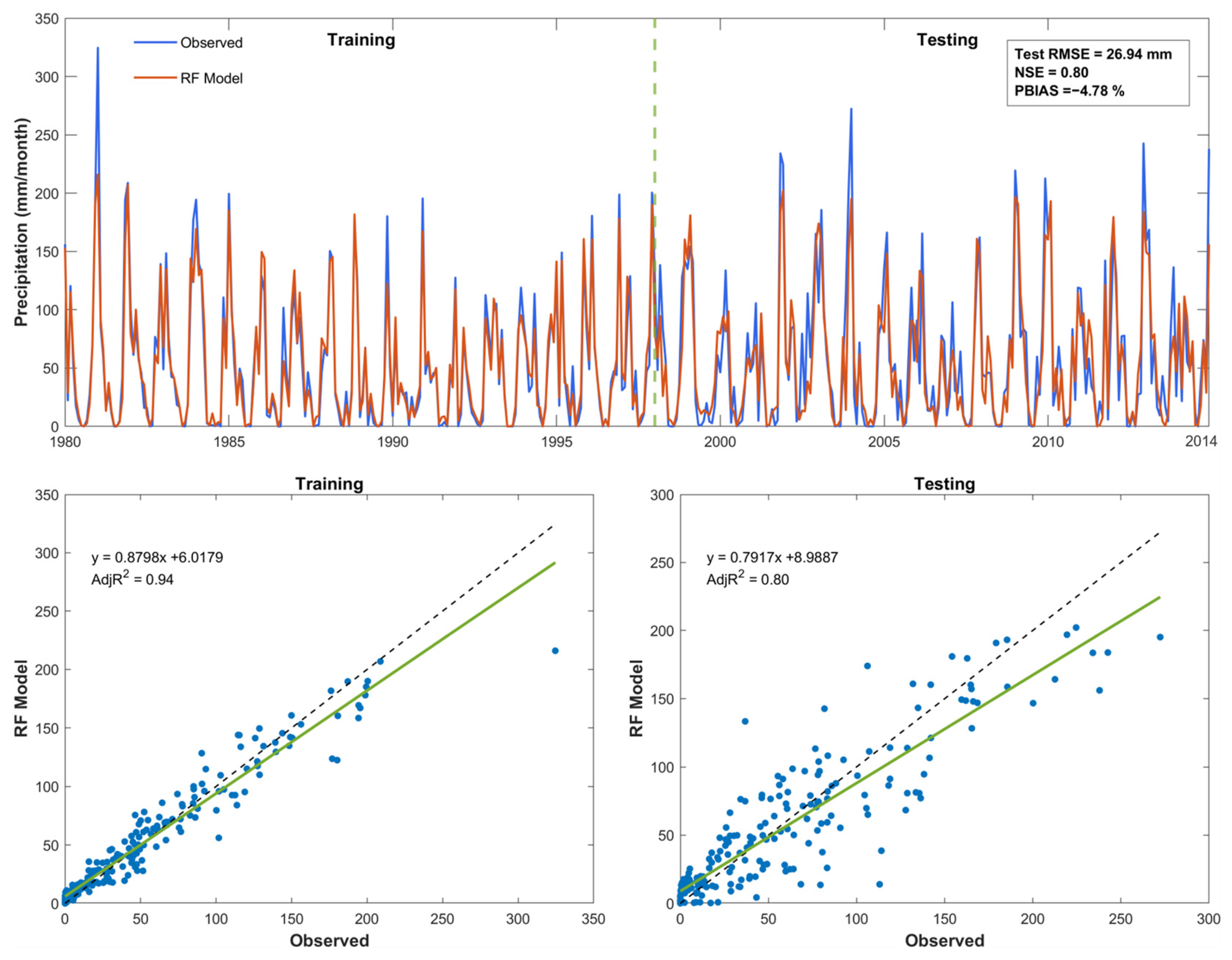 - Model selection: The RF configuration yielding the lowest prediction error during the iterative training process is selected as the optimal model for downscaling [82]