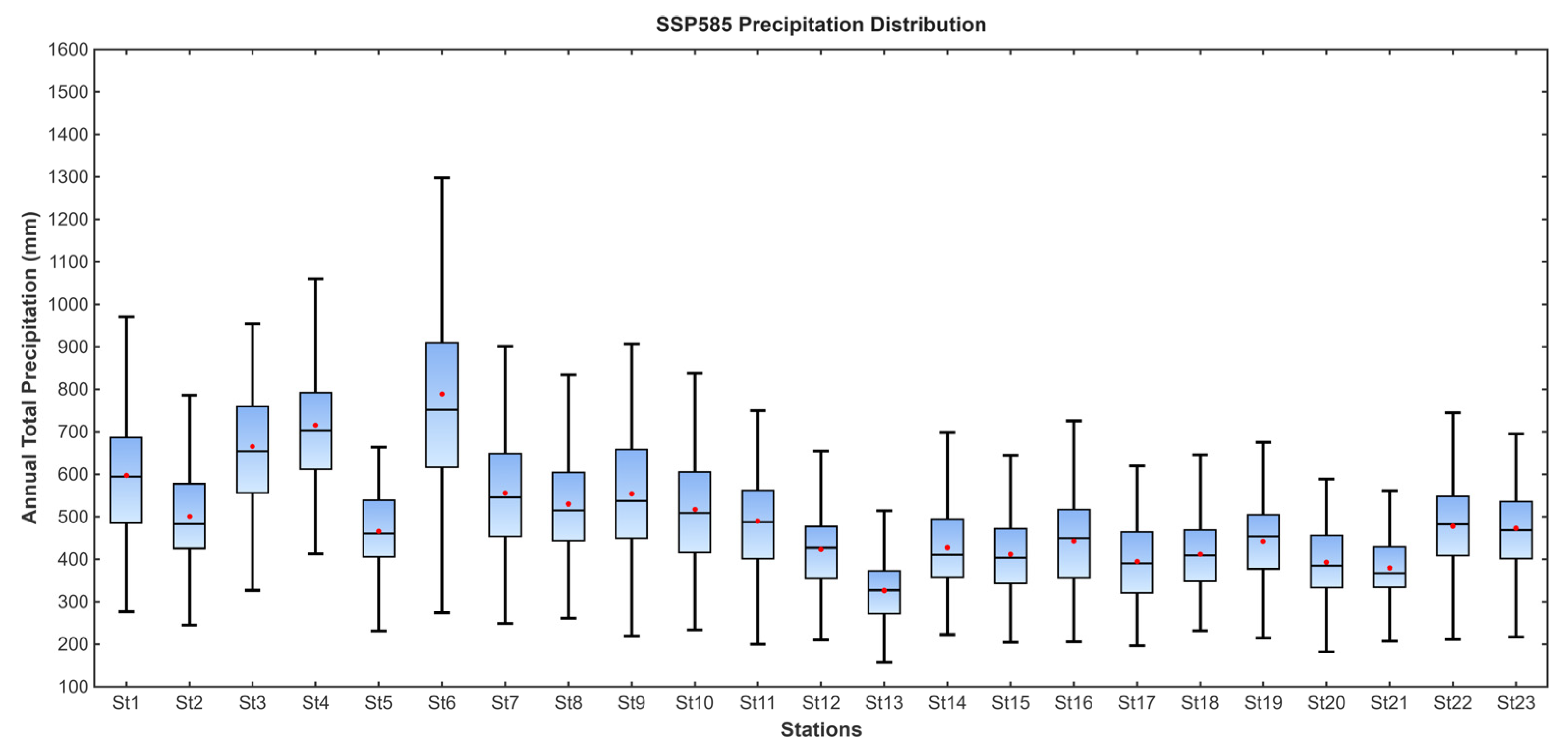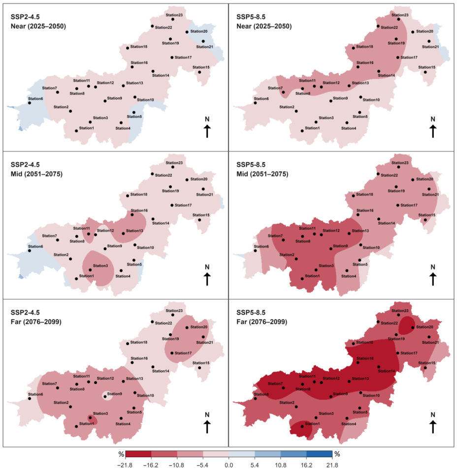 - Generate station-scale monthly precipitation projections from CMIP6 HadGEM3-GC31-LL under SSP2-4.5 and SSP5-8.5 for the near (2025–2050), mid (2051–2075), and late (2076–2099) periods.