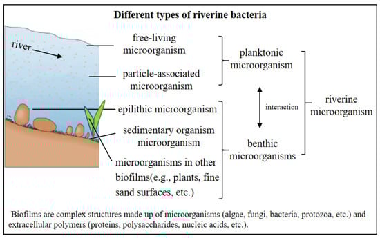 Classification and Sampling Methods for River Bacteria include bacteria, fungi and protozoa. Riverine bacteria can be divided into planktonic bacteria, sedimentary bacteria and epilithic bacteria according to their distribution location and propagation pattern. In this paper, sedimentary bacteria, epilithic bacteria, and bacteria adsorbed on organic or inorganic substrates in the surface layer of the riverbed, except planktonic bacteria, are collectively referred to as sedimentary bacteria. Planktonic bacteria can be subdivided into free-living bacteria suspended in the water and particle-adsorbed bacteria attached to suspended particles. Sedimentary bacteria refer to bacteria in the finer sediment or silt on the riverbed, and epilithic bacteria are bacteria adsorbed in the epilithic biofilm of pebbles. In addition, there are also bacteria adsorbed in the surface biofilm of fine sand, plants, wood, etc. (Romero et al., 2020) [10]. The main categories of riverine bacteria are shown in Figure 1.