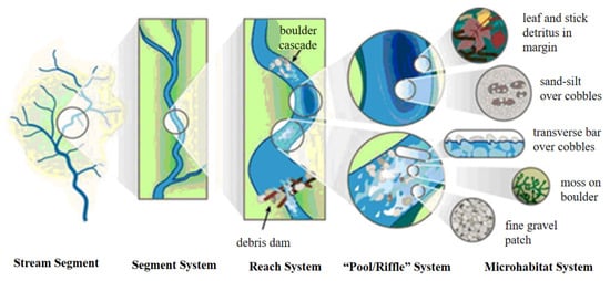 - Frissell, C.A.; Liss, W.J.; Warren, C.E.; Hurley, M.D. A hierarchical framework for stream habitat classification: Viewing streams in a watershed context. Environ. Manag. 1986, 10, 199–214. [Google Scholar] [CrossRef]