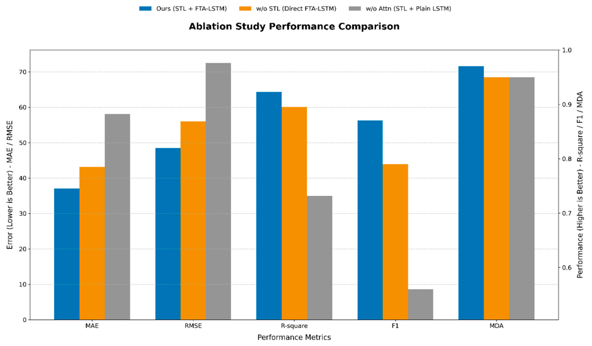 - Based on the validity of (1), do the decomposition-prediction strategy and specialized attention mechanisms in the model work effectively? How much does each module contribute to the overall model performance?