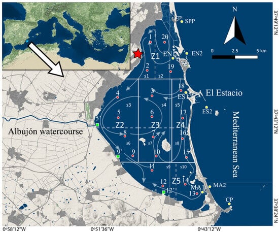Mar Menor monitoring system stations, sectorisation (Z: zone, s: sector), and main currents. The red dots indicate the initial sampling points of the monitoring system (1997). The yellow pentagons indicate the stations added in 2009, and the green squares those added in 2017. The red star indicates the location of the AEMET weather station. The arrows correspond to the dominant currents in the Mar Menor determined by oceanographic modelling [12,30].