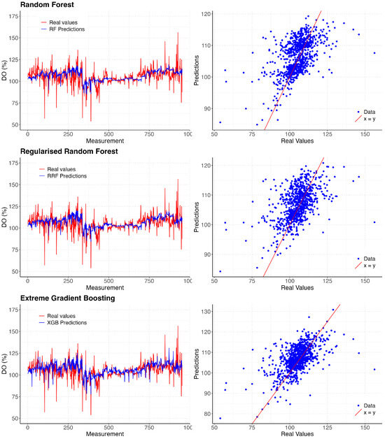 For these reasons, comparing models from different methodological families is essential. Coastal lagoons such as the Mar Menor exhibit marked spatiotemporal heterogeneity, nonlinear interactions among key variables, and causal relationships operating at multiple temporal scales; predictive skill therefore varies across algorithms. Tree-based models appear to be the most suitable for complex ecological systems. Random Forest (RF) and eXtreme Gradient Boosting (XGB) models consistently outperformed linear models (Ridge, Lasso, and Elastic Net) and other nonlinear models (SVR-RBF, KNN) in predicting dissolved oxygen, combining accuracy, stability, and consistency, in line with previous studies highlighting the effectiveness of regression tree-based approaches in environmental prediction and classification problems [18,50,52]. This shows that the nonlinear, synergistic relationships in the coastal lagoon are best captured by ensemble tree methods.