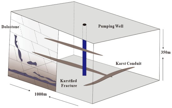 The karst aquifer system is widely distributed in the world and is of great significance for resource development. However, due to its unique dual medium structure [1] (fracture-pore matrix and karst conduit), it shows strong heterogeneity and anisotropy, which brings challenges to the evaluation and development of groundwater resources. As the core means of obtaining hydrogeological parameters (such as permeability coefficient and water storage coefficient), traditional pumping tests are usually based on the Theis equation or Dupuit hypothesis, that is, assuming that the aquifer is homogeneous in the same direction [2]. However, in the karst development area, the groundwater flow often moves together with the low-permeability matrix through the high-permeability karst conduit, forming a complex conduit–matrix coupling flow. The deviation of the pumping test parameter method based on the homogeneous hypothesis is caused.