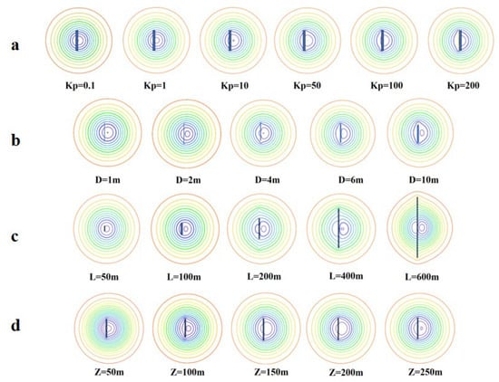 Acting as a preferential flow path due to its high conductivity, the karst conduit locally reduces the hydraulic gradient in its vicinity. This redirects streamlines from a concentric pattern towards the conduit itself. Enhancing the conduit’s transmissive properties—by increasing its hydraulic conductivity (Kp), length (L), or diameter (D)—intensifies and expands the resulting flow field distortion (Figure 6). Conversely, the insensitive factors—conduit burial depth (Z) and pumping rate (Q)—affect the timing of the conduit’s response and the stress magnitude but do not reshape the fundamental flow pattern established by the conduit’s conductivity.