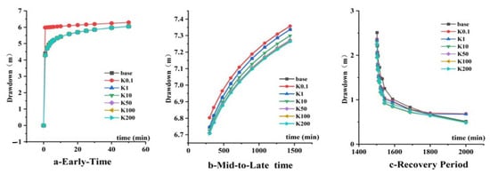 For models with different conduit hydraulic conductivities: In the early pumping phase (Figure 7a), the model featuring a low-conductivity conduit (Kp = 0.1 m/d) displayed the maximum drawdown at the well. The drawdown curves from other models were virtually identical to the baseline model’s curve. As pumping continued into the mid-to-late phase (Figure 7b), the final drawdown amplitude diminished with increasing conduit conductivity. During the recovery phase (Figure 7c), high-conductivity conduits facilitated a more rapid water level recovery.