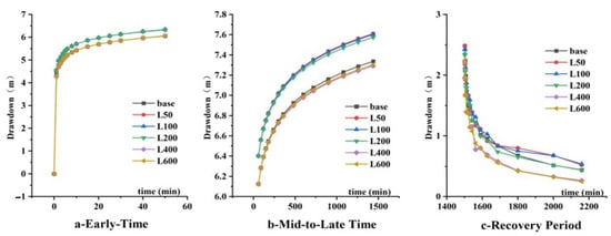 The drawdown curves diverged significantly with conduit length. For short conduits (L ≤ 200 m), the drawdown exceeded that of the baseline model during the mid-to-late pumping phases (Figure 9b). In contrast, models with long conduits (L ≥ 200 m) consistently exhibited lower drawdown than the baseline (Figure 9a,b). During recovery, a longer conduit length correlates with a more rapid water level rebound (Figure 9c).