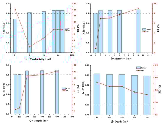 The inversion error (RE) shows a monotonic increase with conduit diameter. Furthermore, the estimated Kinv for all scenarios exceeded the baseline value of 0.8 m/d (Figure 11b).