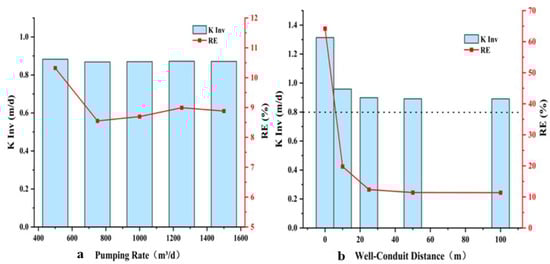 The inverted hydraulic conductivity (Kinv) decreased with greater well-conduit distance (R). Correspondingly, the relative error (RE) declined sharply from 64.22% to 12.37% as R increased from 0 to 25 m, and plateaued at approximately 11.4% for R ≥ 50 m (Figure 15b).