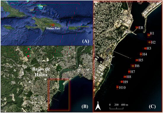 (A) Location of Haina Port in the Dominican Republic. (B) Location of the study area. (C) Sample points in Haina Port (Caribbean Sea), H1 to H10. ER corresponds to the sample in the Haina River estuary.
