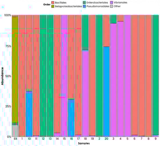 Phyla on an order level, ordered by relative abundance. ER: Haina River estuary; H1: samples 1, 2; H2: samples 3, 4; H3: samples 5, 6; H4: samples 7, 8; H5: samples 9, 10; H6: samples 11, 12; H7: samples 13, 14; H8: samples 15, 16; H9: samples 17, 18; H10: samples 19, 20.