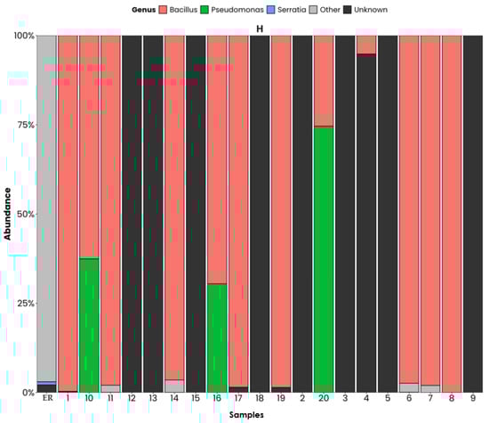 Phyla on a genus level, ordered by relative abundance. ER: Haina River estuary; H1: samples 1, 2; H2: samples 3, 4; H3: samples 5, 6; H4: samples 7, 8; H5: samples 9, 10; H6: samples 11, 12; H7: samples 13, 14; H8: samples 15, 16; H9: samples 17, 18; H10: samples 19, 20.
